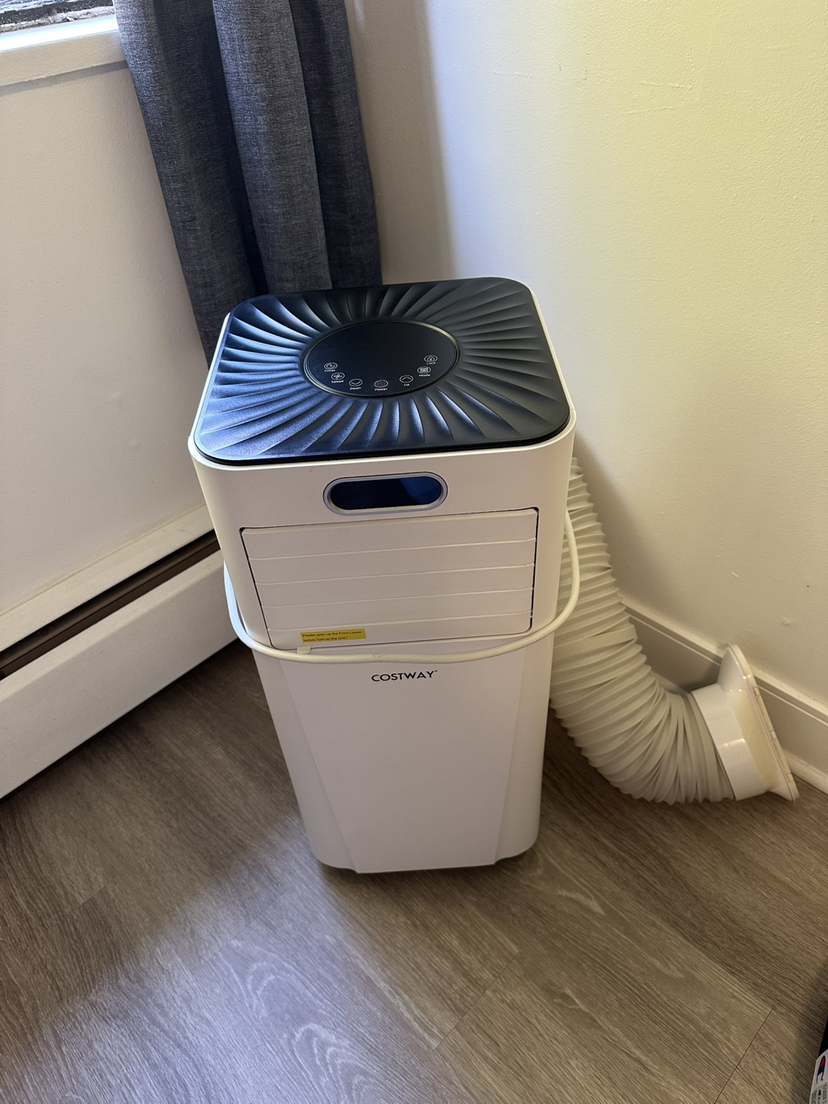 This portable air conditioner is a great way to cool your home. It is easy to move from room to room and can be used in any space. It is in working condition. 3 modes - Fan, AC, Humidifier. Comes with window kit, super easy to install.