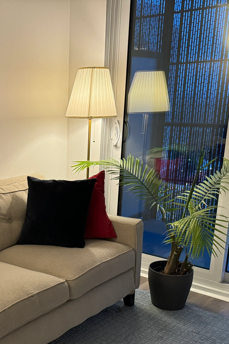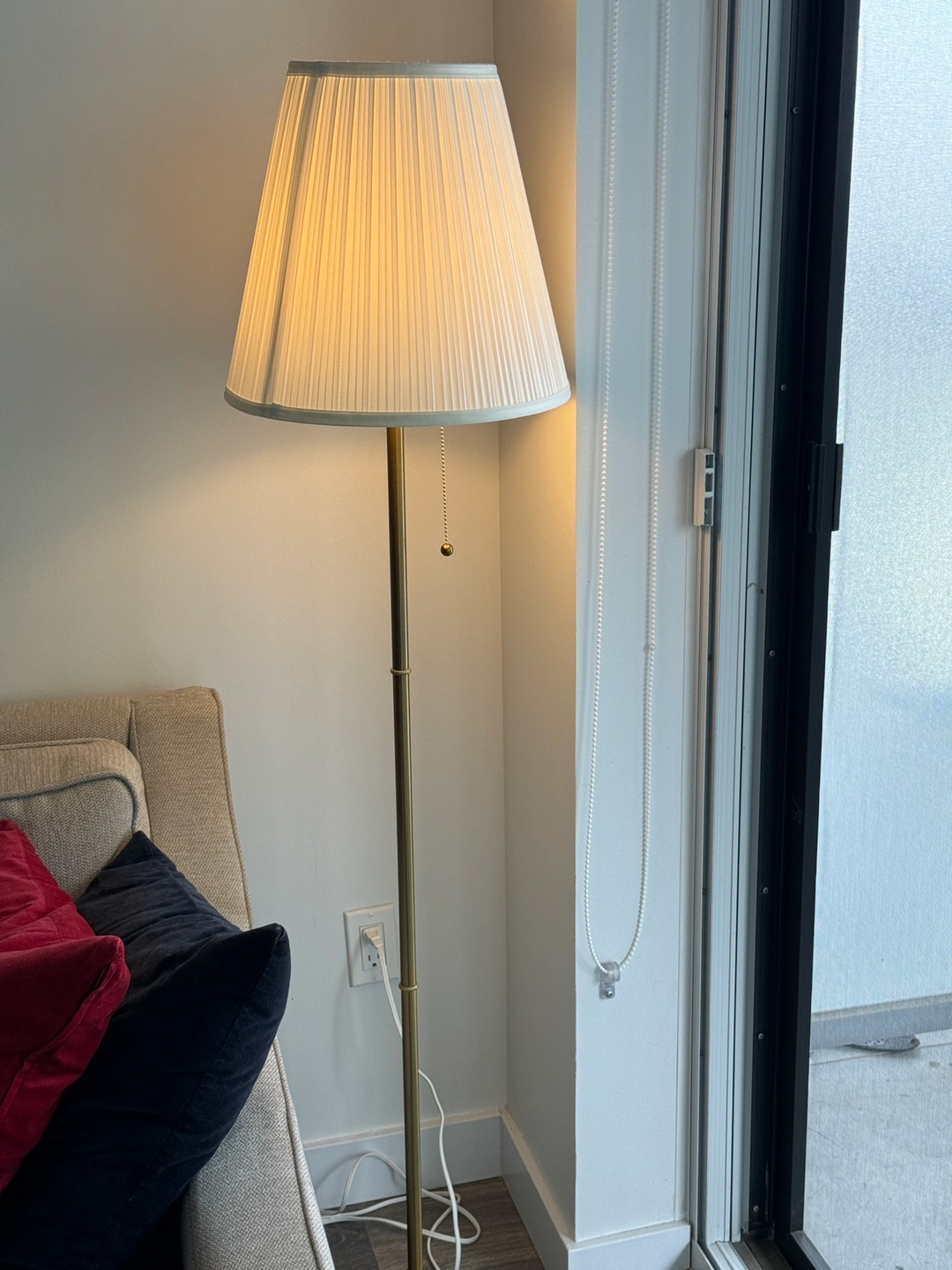 A floor lamp with a linen shade and brass accents. It is a simple design that can complement any decor.