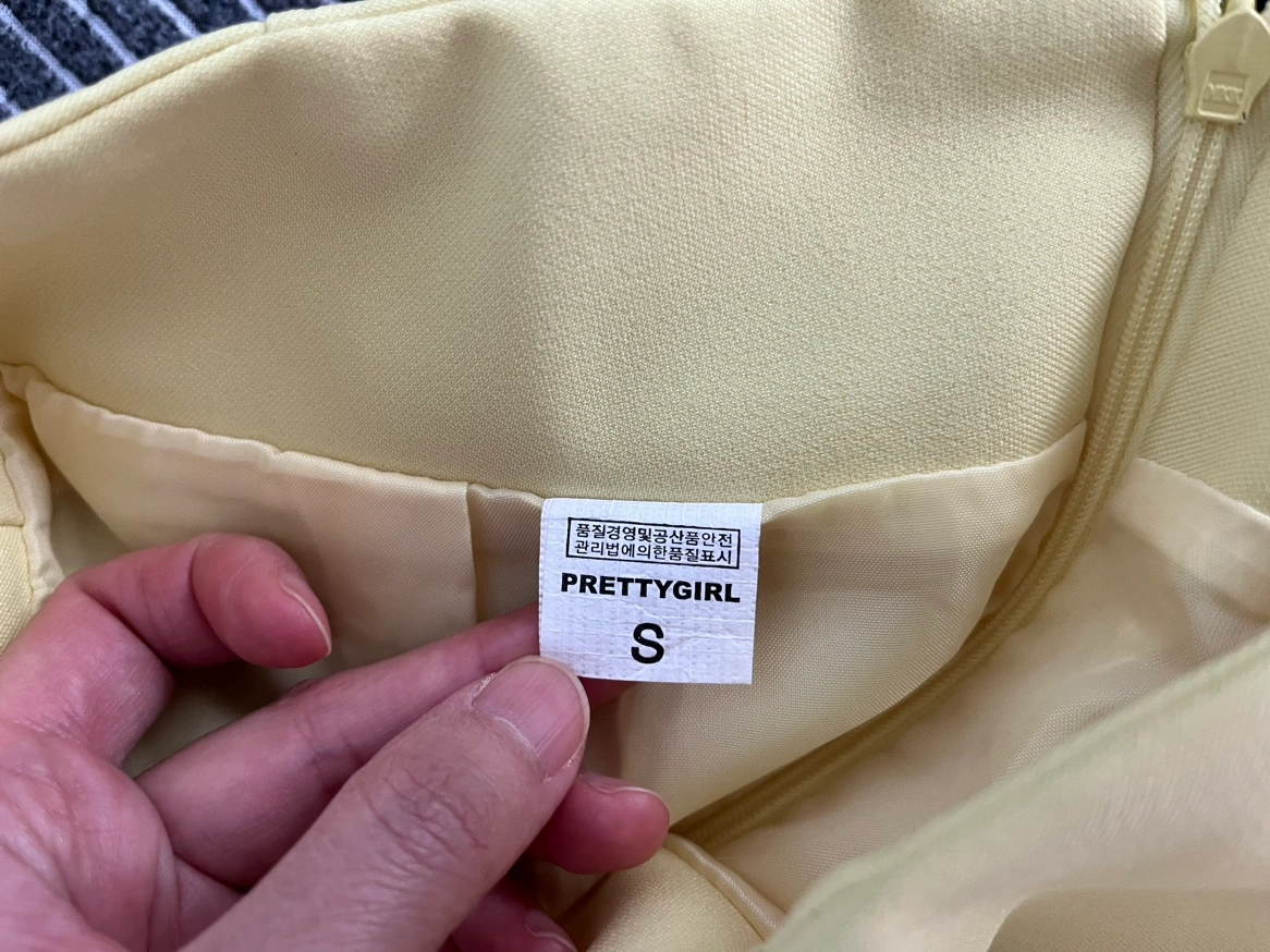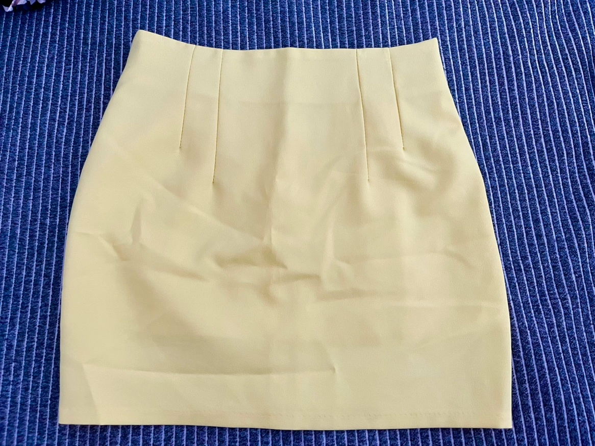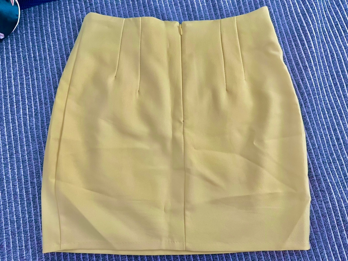 A cute yellow mini skirt with a zipper closure. Yellow short skirt, Size S, Made in Korea. Length: 15.5", Waist: 13.5". I love the color—it's a really pretty light greenish-yellow (quite different from the photos), but unfortunately, it's too small for me Worn just once