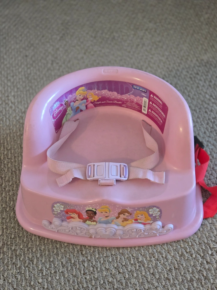Pink princess booster seat. Comes with lap belt and one seat belt.