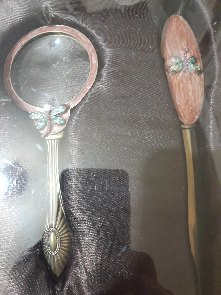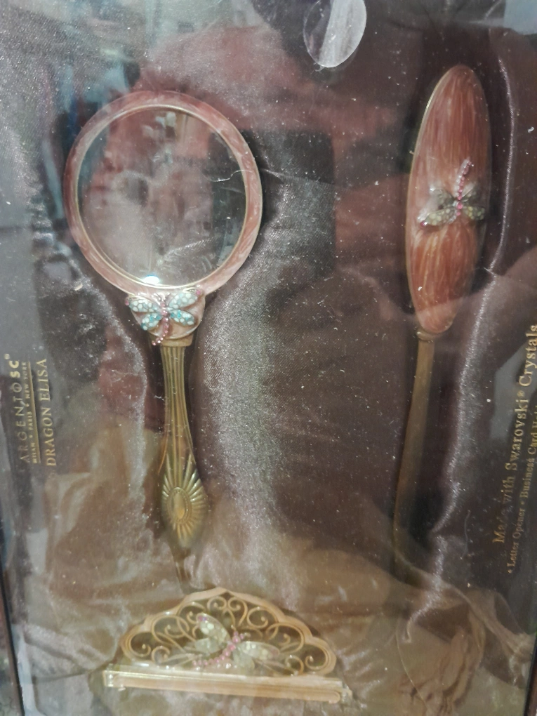 Set includes a letter opener, magnifying glass, and business card holder. All pieces are decorated with a dragonfly and Swarovski crystals. The set comes in its original box.