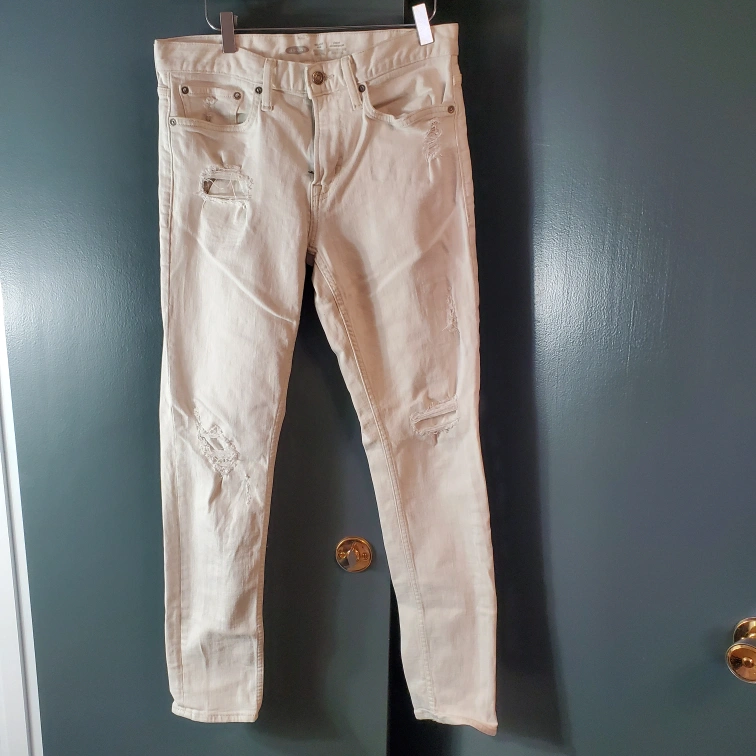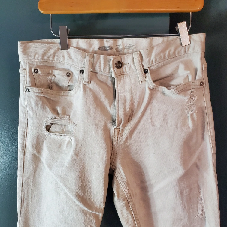 White distressed skinny jeans by Old Navy. Jeans have flex. Jeans have some marks down the legs. Not very noticeable. Located northside by londonderry mall.
