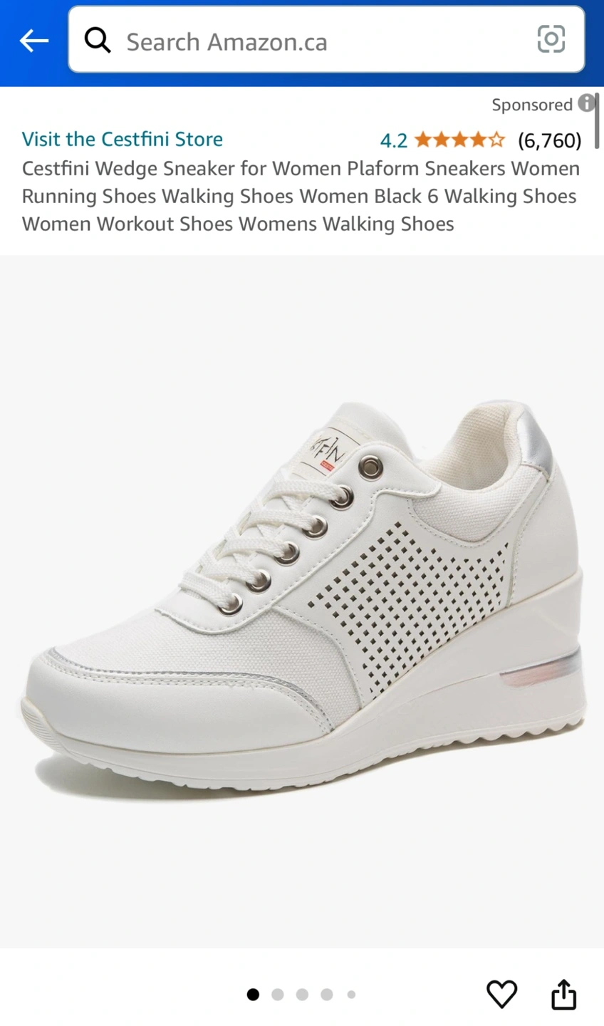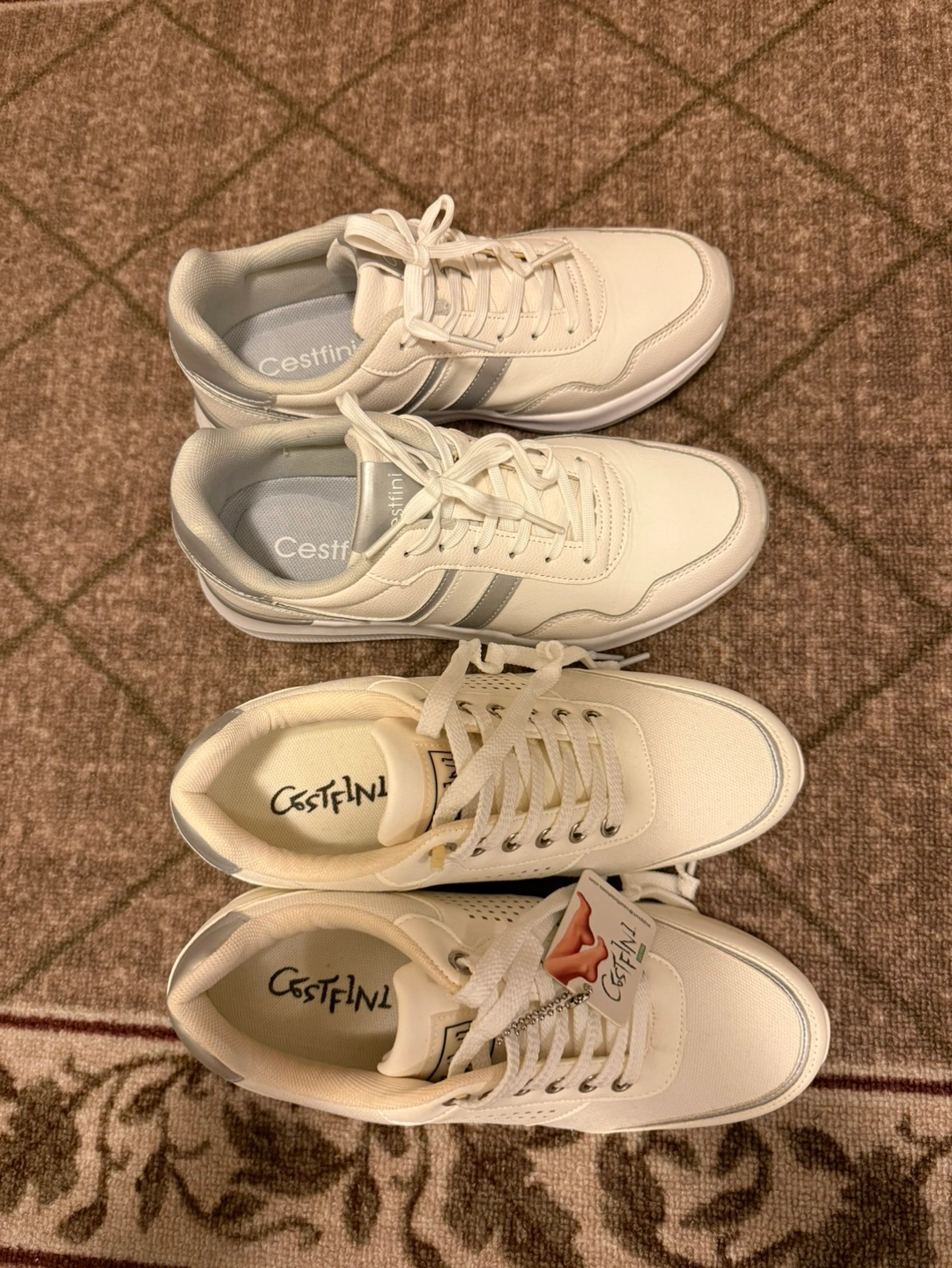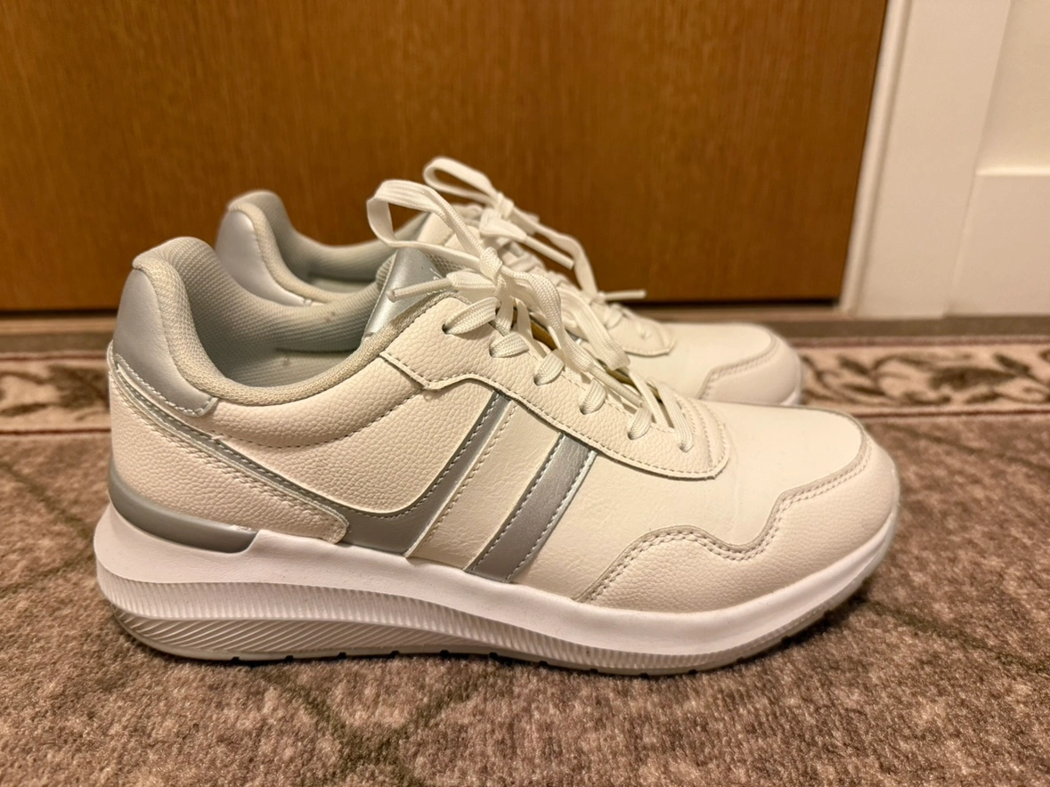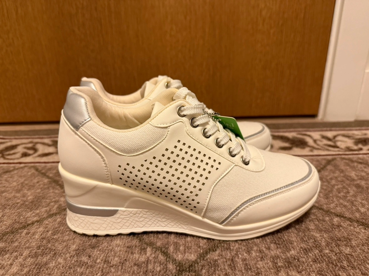 White sneakers with a silver accent. They have a platform sole and are lace-up.