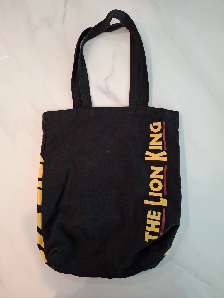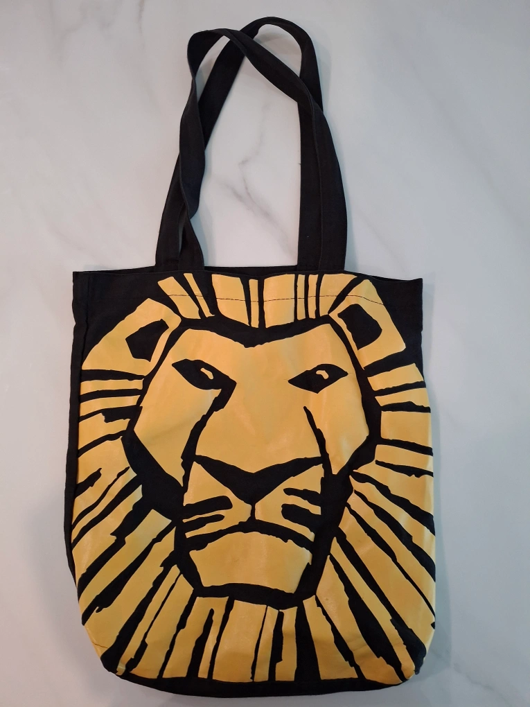 Black canvas tote bag with a yellow lion face and "The Lion King" written on the side. An official merch from the Broadway musical. 12" x 14".