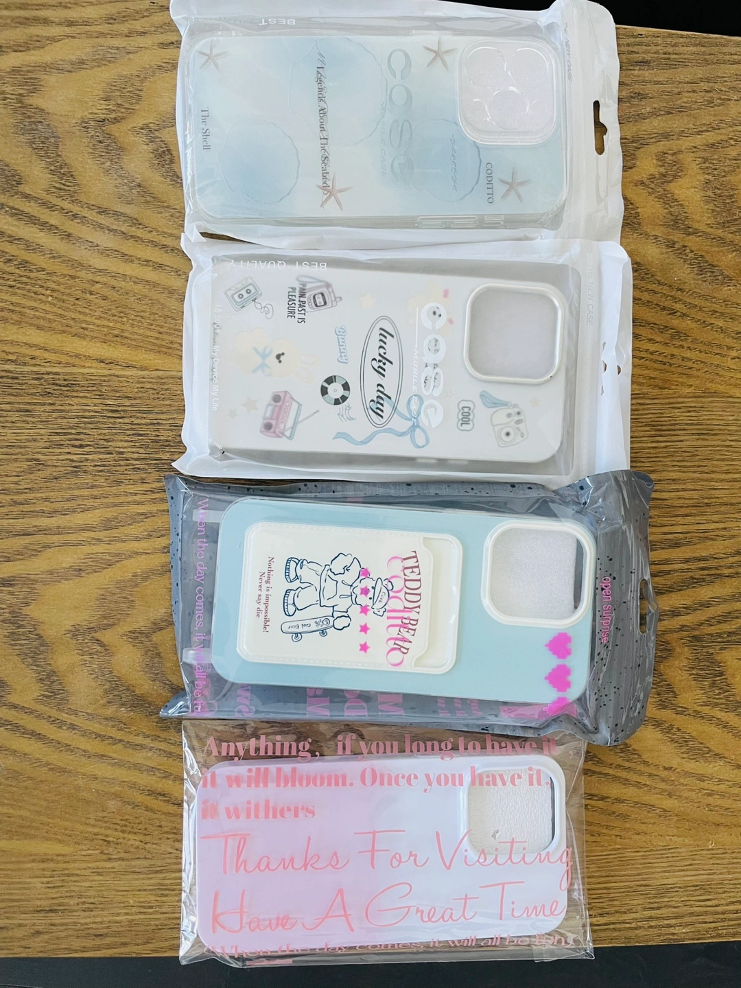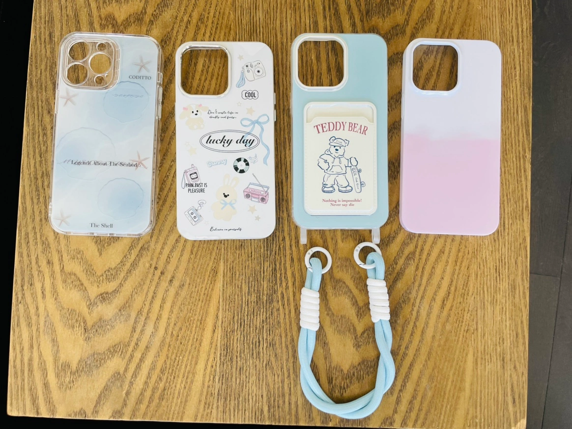 Four phone cases for the iPhone 14 Pro Max. Each phone case has a unique design. The set includes a phone strap.