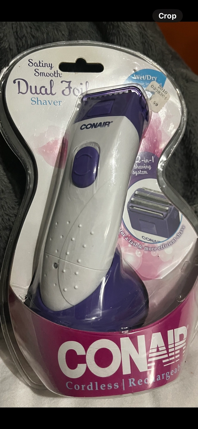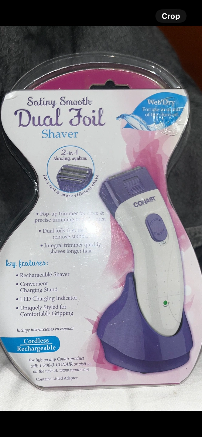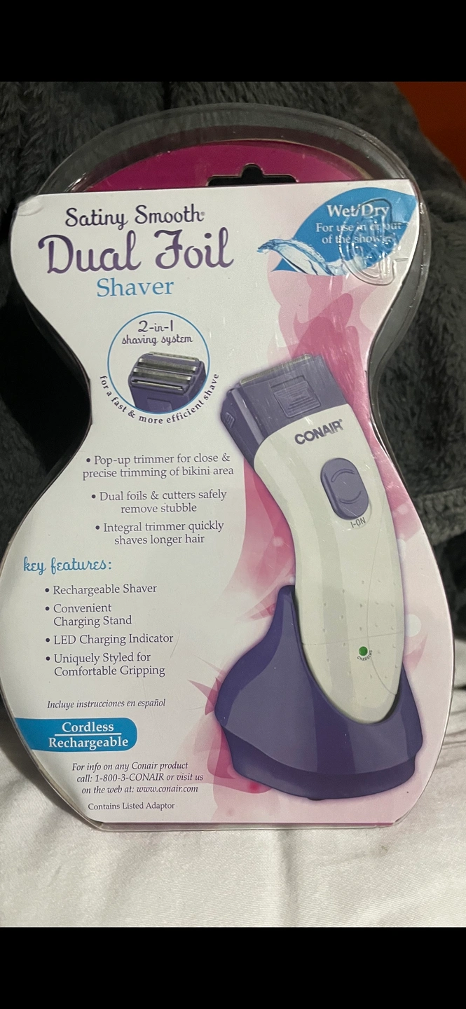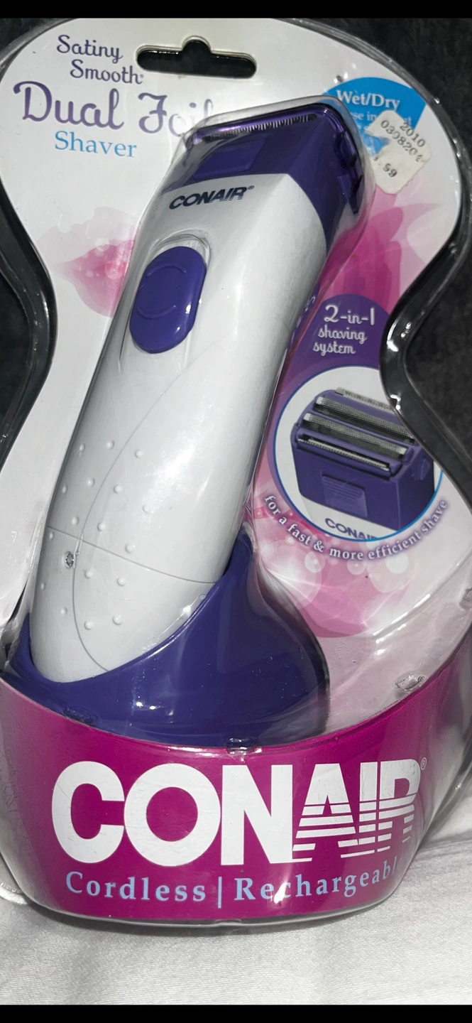 Conair cordless rechargeable dual foil shaver. It is purple and white. It is a 2-in-1 shaving system for a fast and more efficient shave. It is Wet/Dry and features pop-up trimmer for close and precise trimming of bikini area. It has dual foils and cutters that safely remove stubble. It also has an integral trimmer that quickly shaves longer hair.