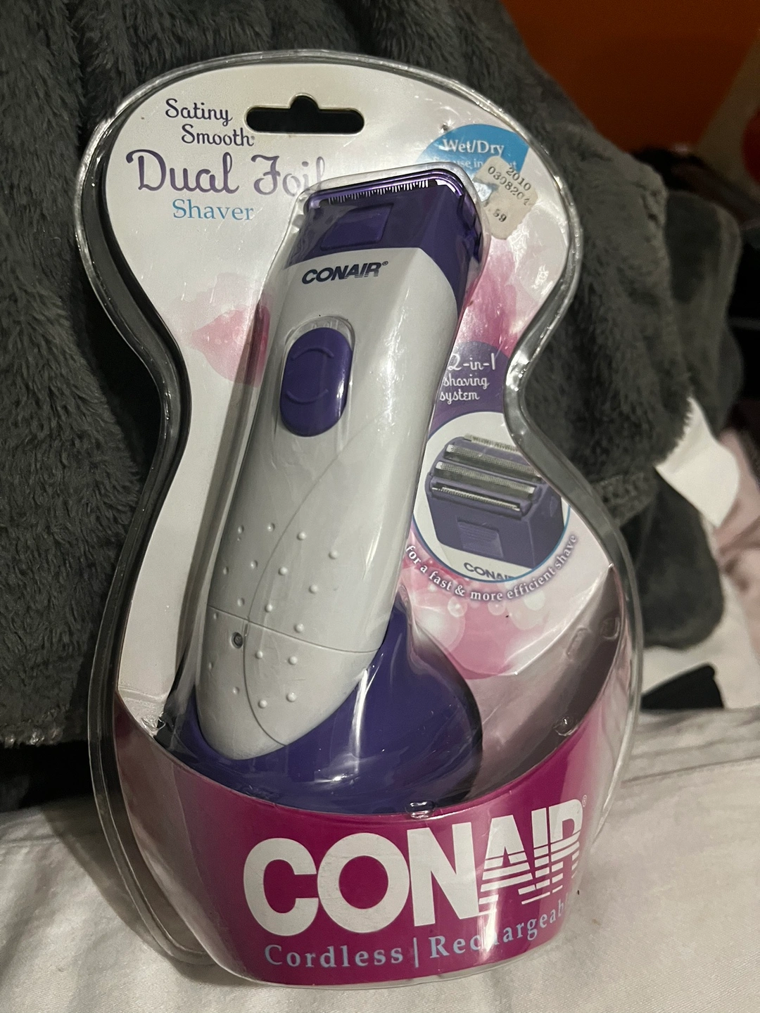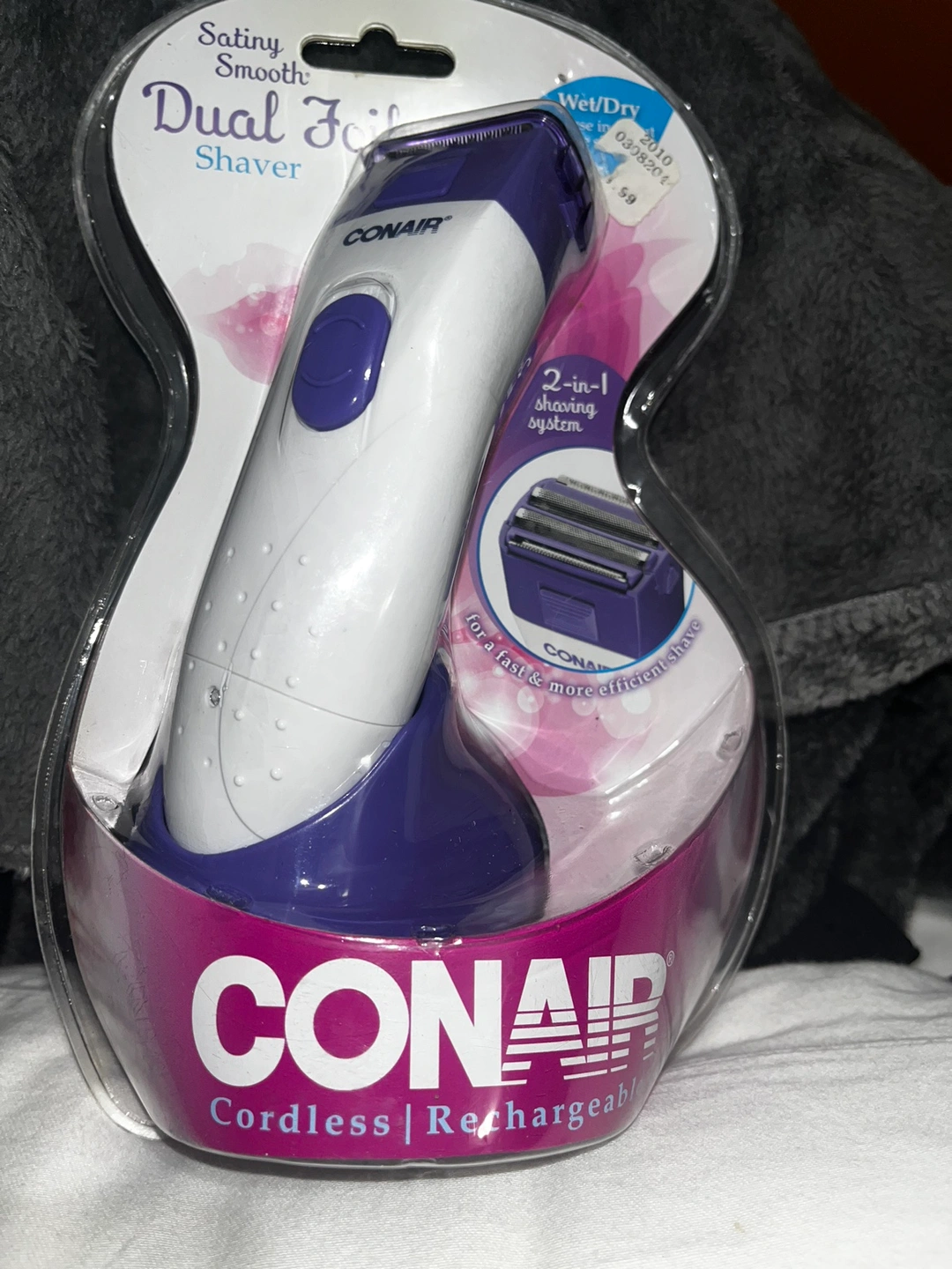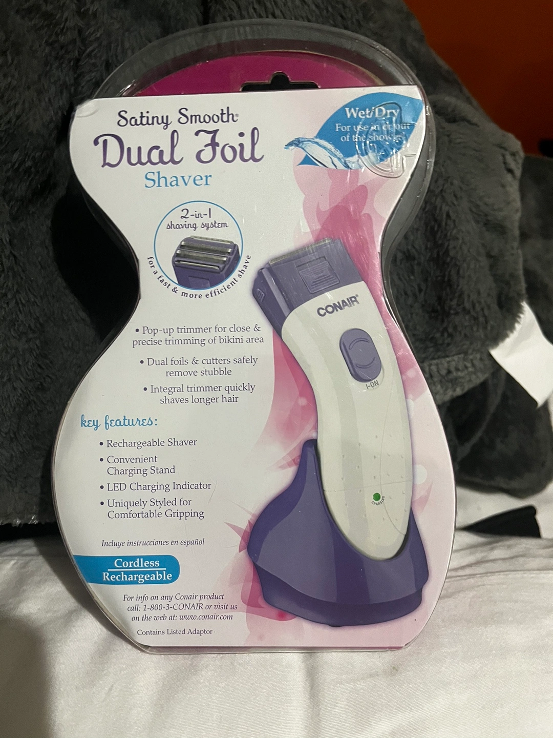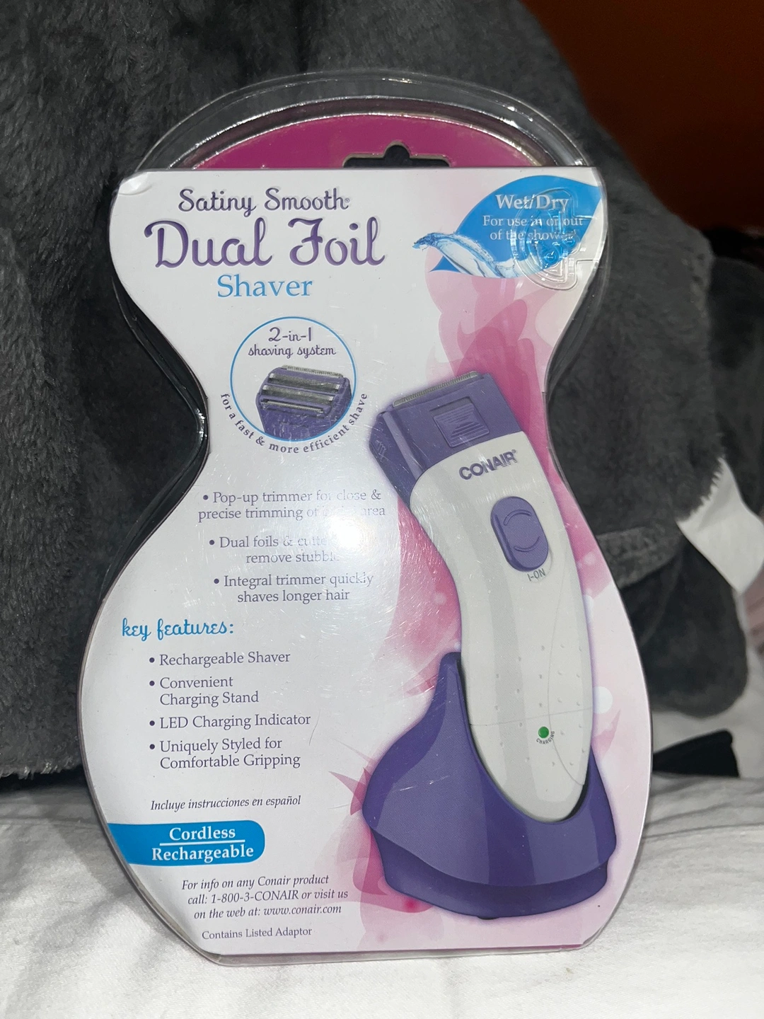 Conair cordless rechargeable dual foil shaver. It is purple and white. It is a 2-in-1 shaving system for a fast and more efficient shave. It is Wet/Dry and features pop-up trimmer for close and precise trimming of bikini area. It has dual foils and cutters that safely remove stubble. It also has an integral trimmer that quickly shaves longer hair.