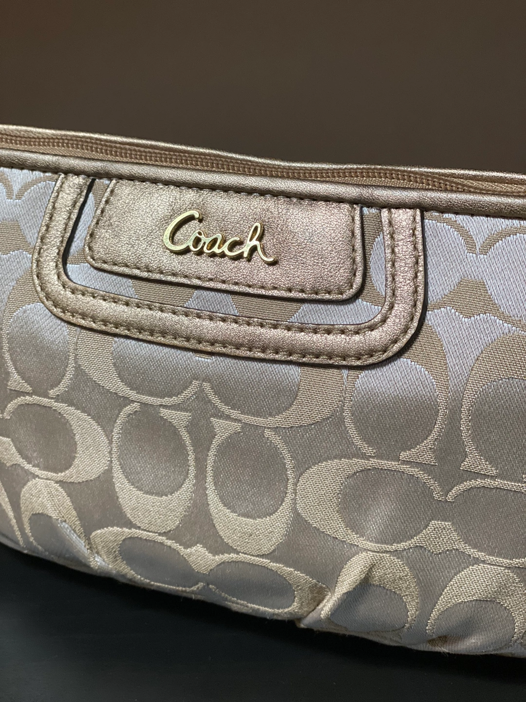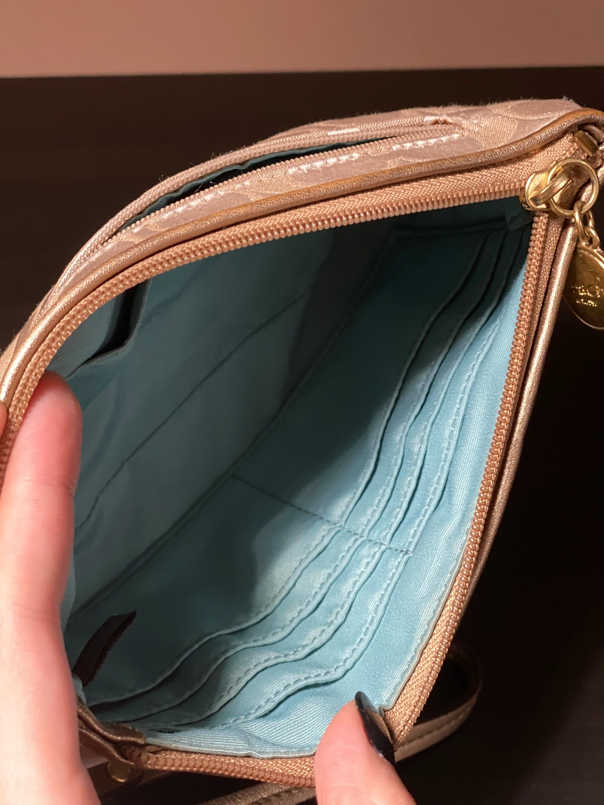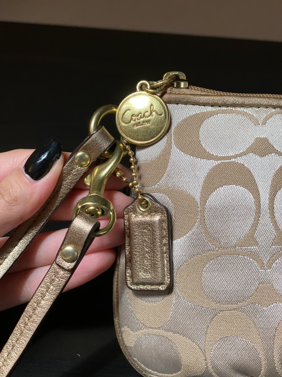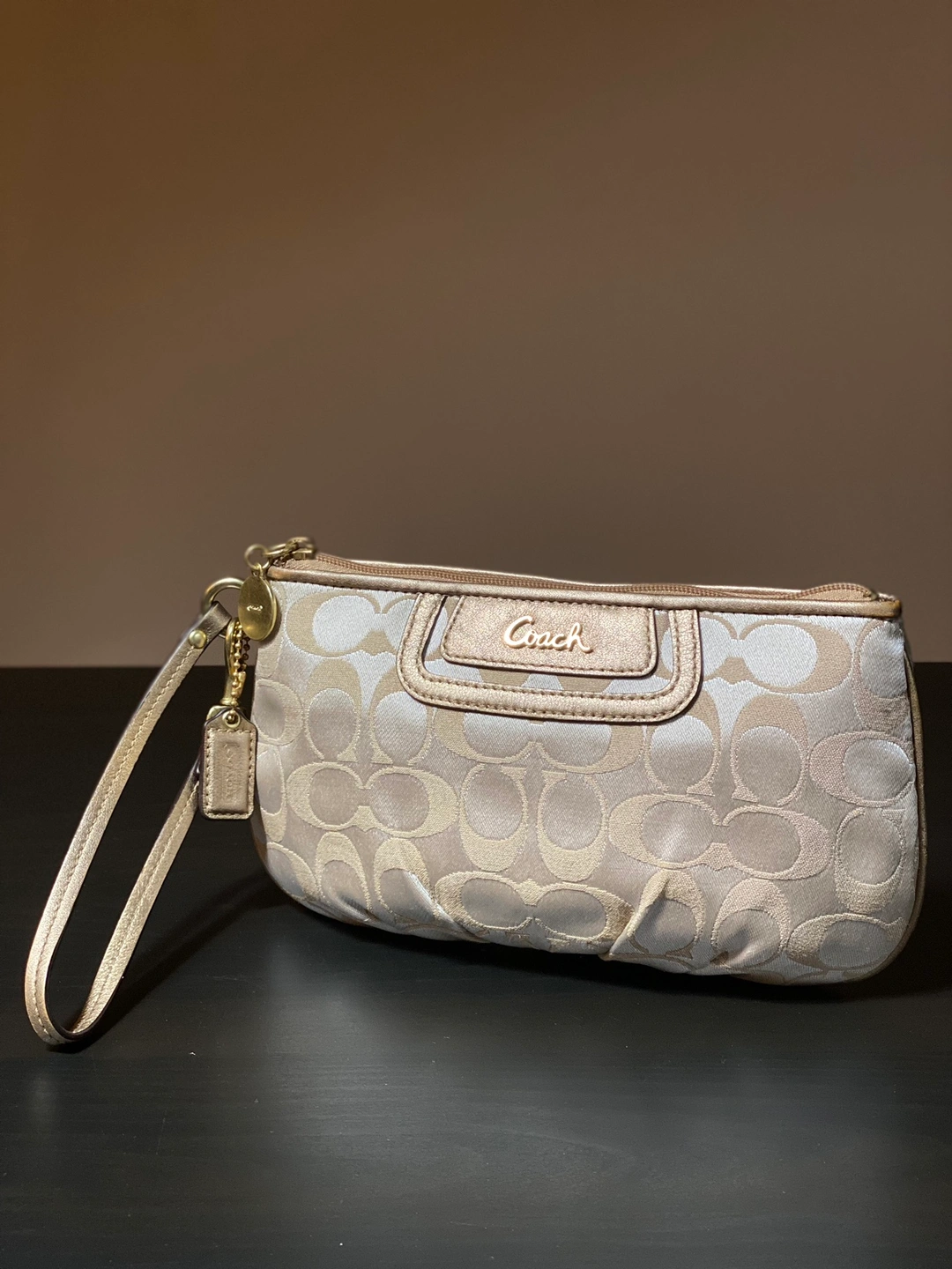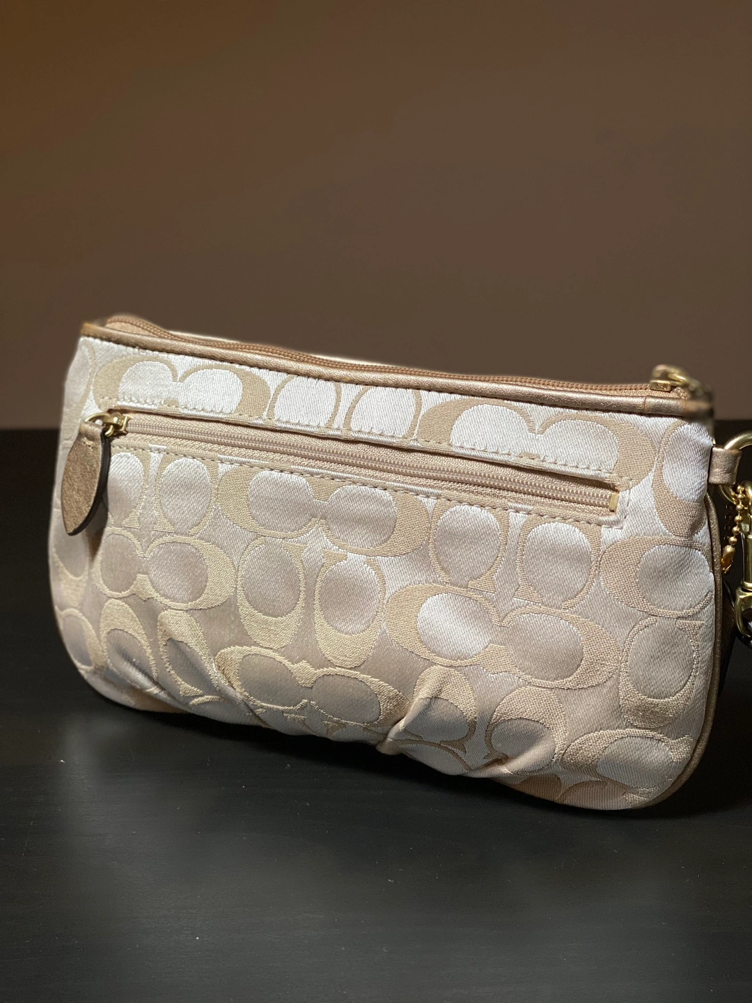 A beige Coach wristlet with a gold-coloured zipper, strap, and logo. It has a blue interior. The wristlet includes a zip pocket and many card slots. There is a small leather Coach tag attached to the wristlet strap.