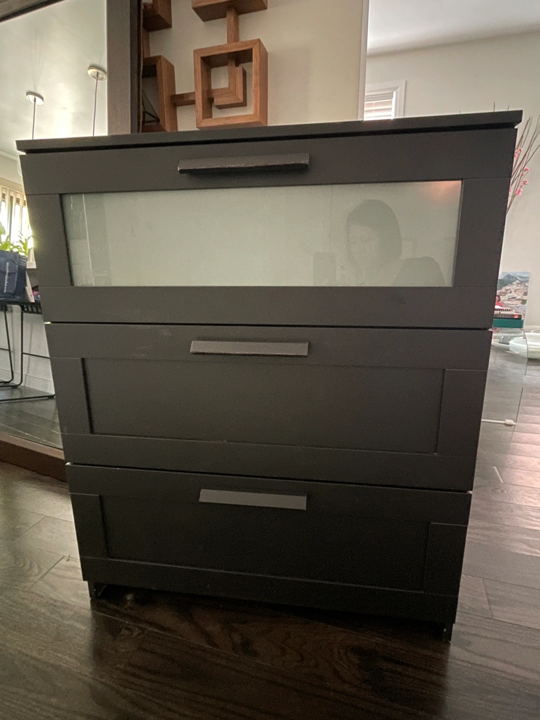 485A three-drawer dresser with a black/dark brown finish and a frosted glass drawer. Retails for $249 Height: 95 cm (37 3/8 ") Width: 78 cm (30 3/4 ") Depth: 46 cm (18 1/8 ") Pick up only Yonge and 16th