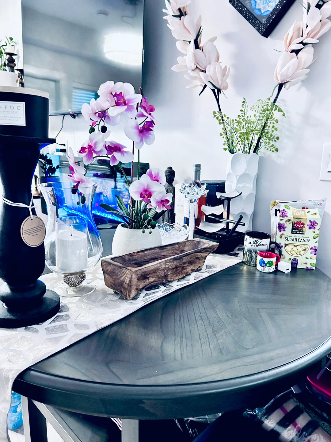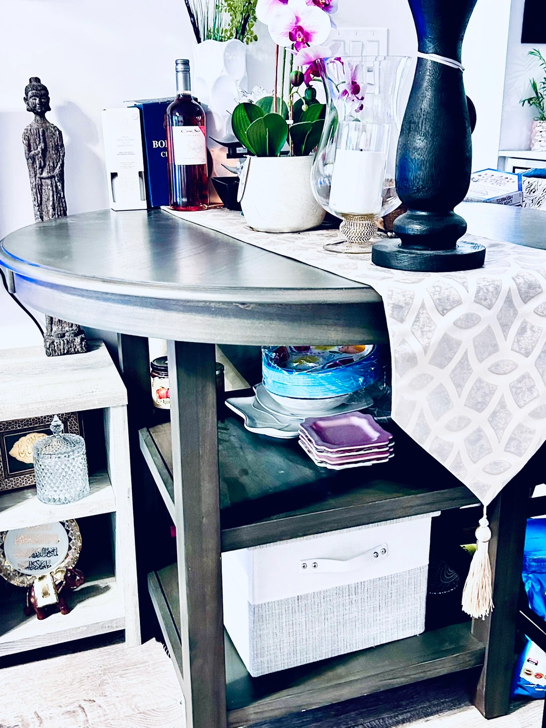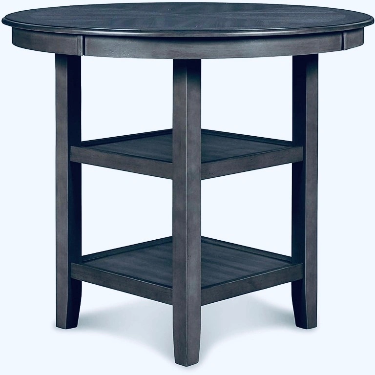 This is an upscale solid wood table with two storage shelves. We paid $1199+ before tax for the table. 42”Wx 36” H.