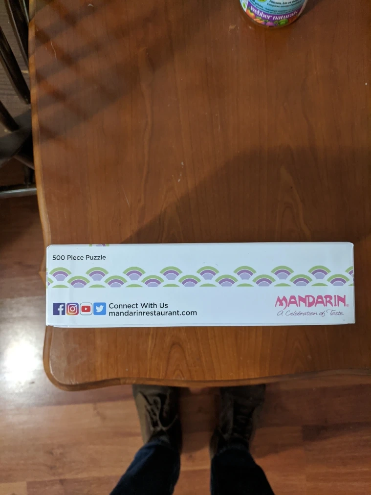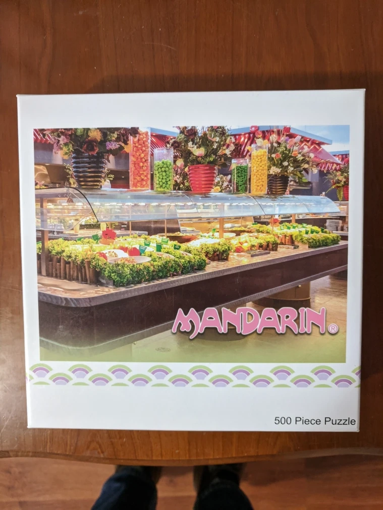 This is a new, unopened 500 piece jigsaw puzzle of a Mandarin Restaurant buffet. It is still in its original box. This is the perfect gift for a puzzle lover.