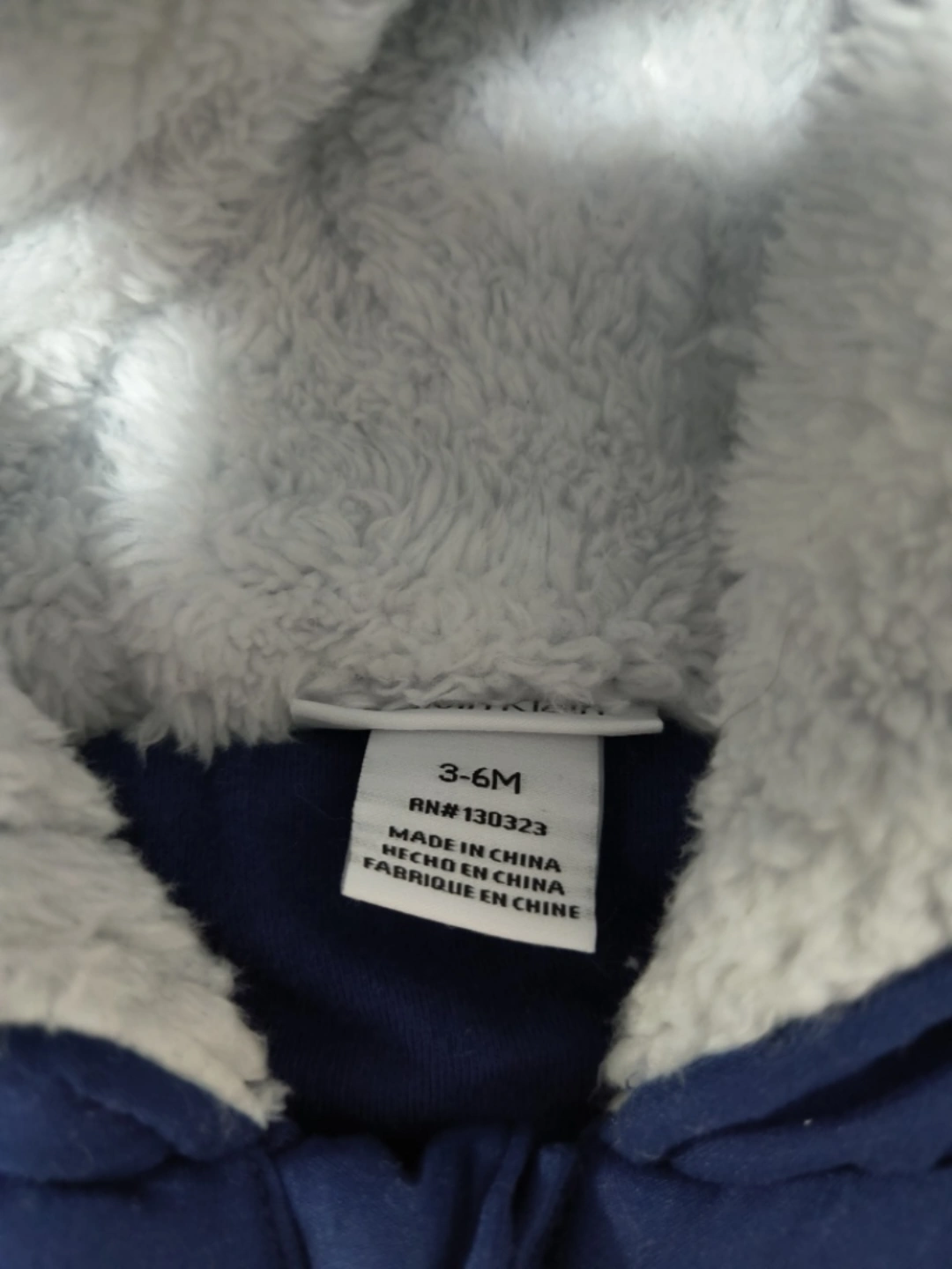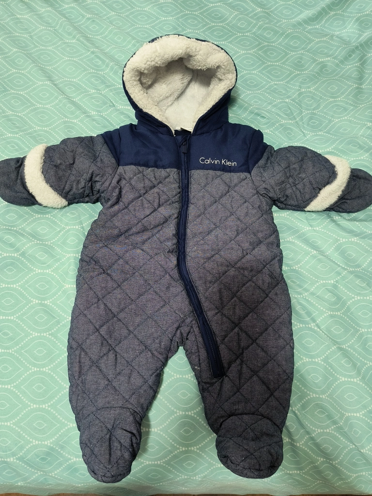 Baby snowsuit in size 3-6 months with a navy blue quilted exterior, white faux fur lining, and a hood.
