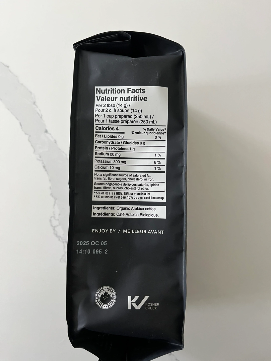 One pound bag of whole bean coffee. Organic, Fairtrade, and medium roast. The flavour profile is bright, fruit and cocoa, and heavenly. Best before Oct 2025.