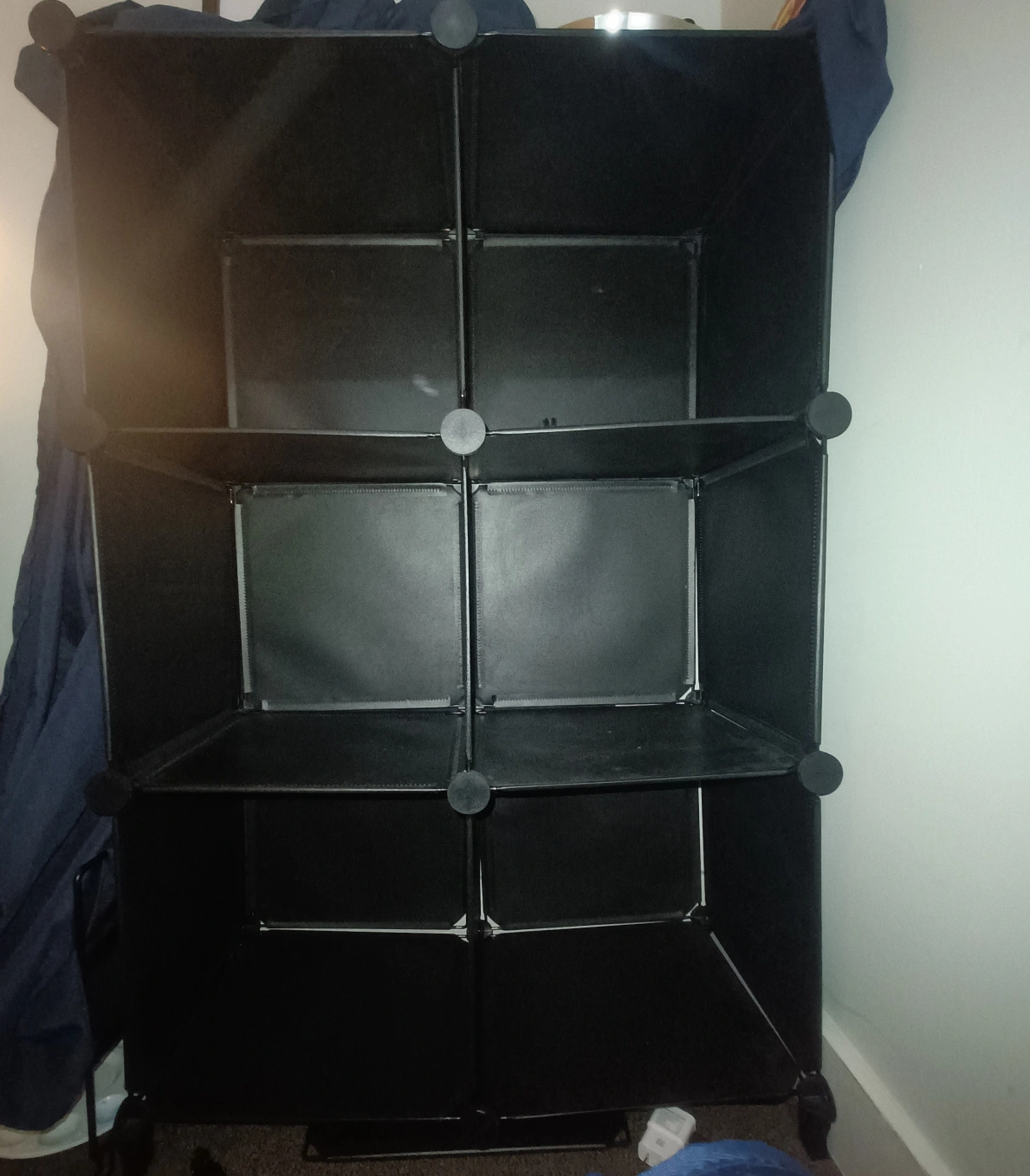 281A six cube storage shelf. Perfect for storing your belongings. Easy to assemble and disassemble. The shelf is made of black plastic and features a cubical design. It includes adjustable shelves. The shelf has a simple, modern design that would be suitable for any home. Each cube can be used for storing books, clothes, shoes, or any other item. Selling because I have bought a new shelf Pickup at Osgoode or St Andrew station.