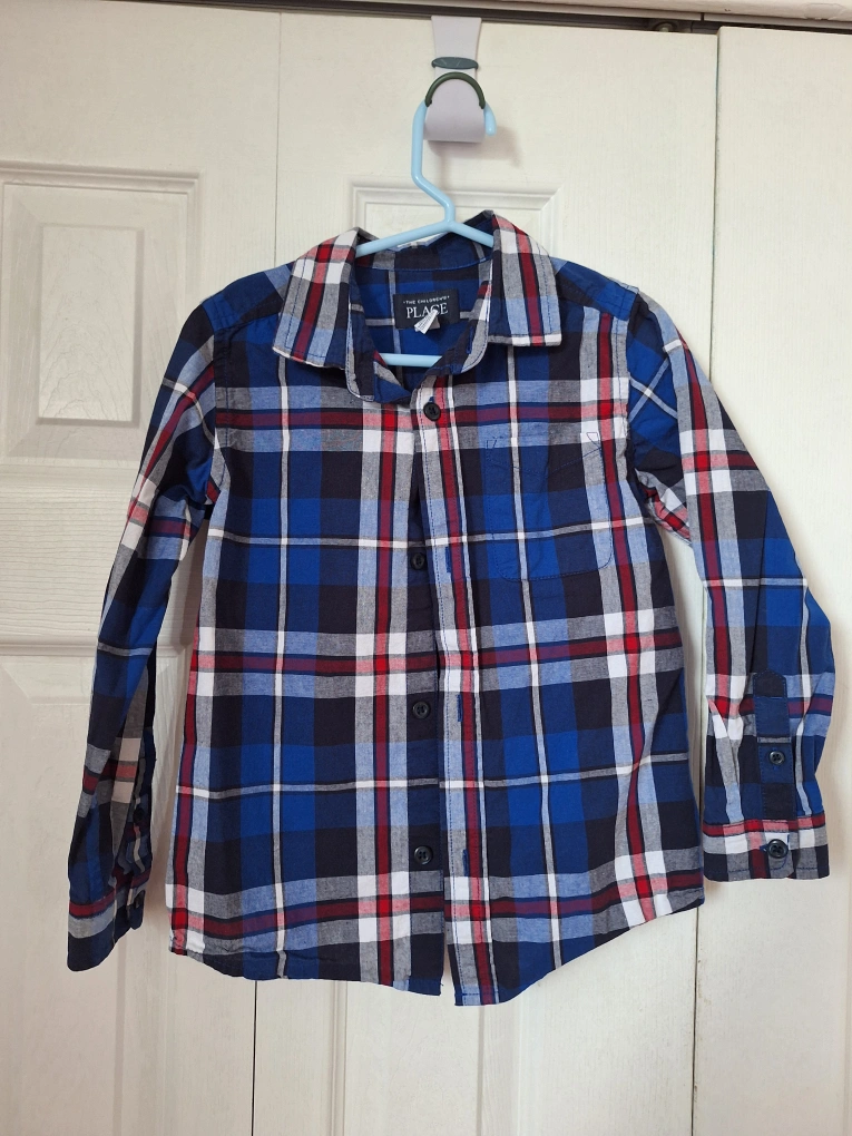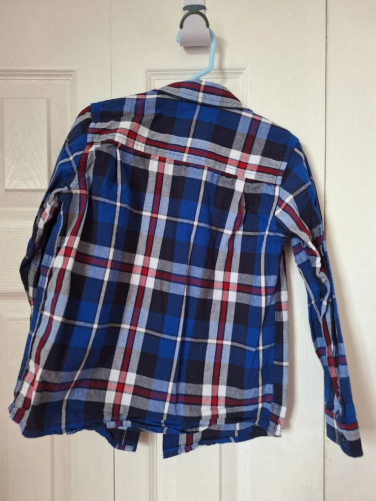 529Blue, red and white plaid long-sleeved button-down shirt. In great condition for that special occasion. * Check out my other ads for great deals on clothing and more*