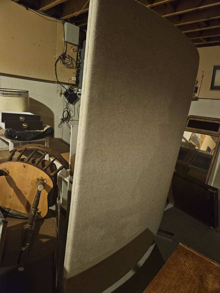 This is a large, curved room divider in great shape. It is free standing and is a beautiful addition to any room. It is made of a durable, light beige material.