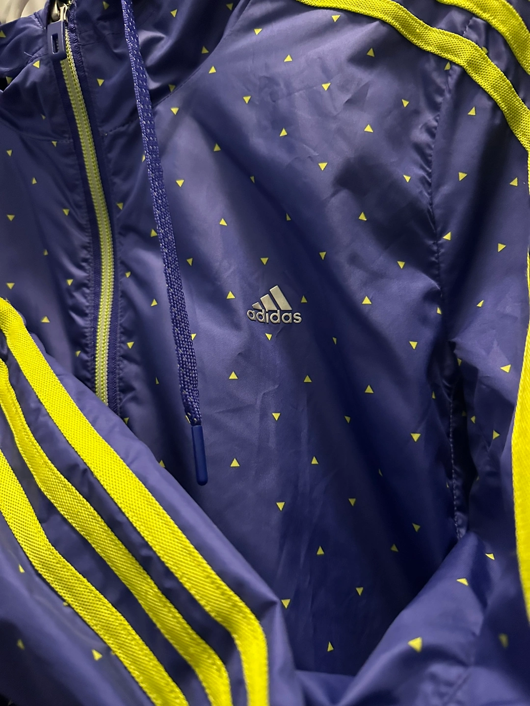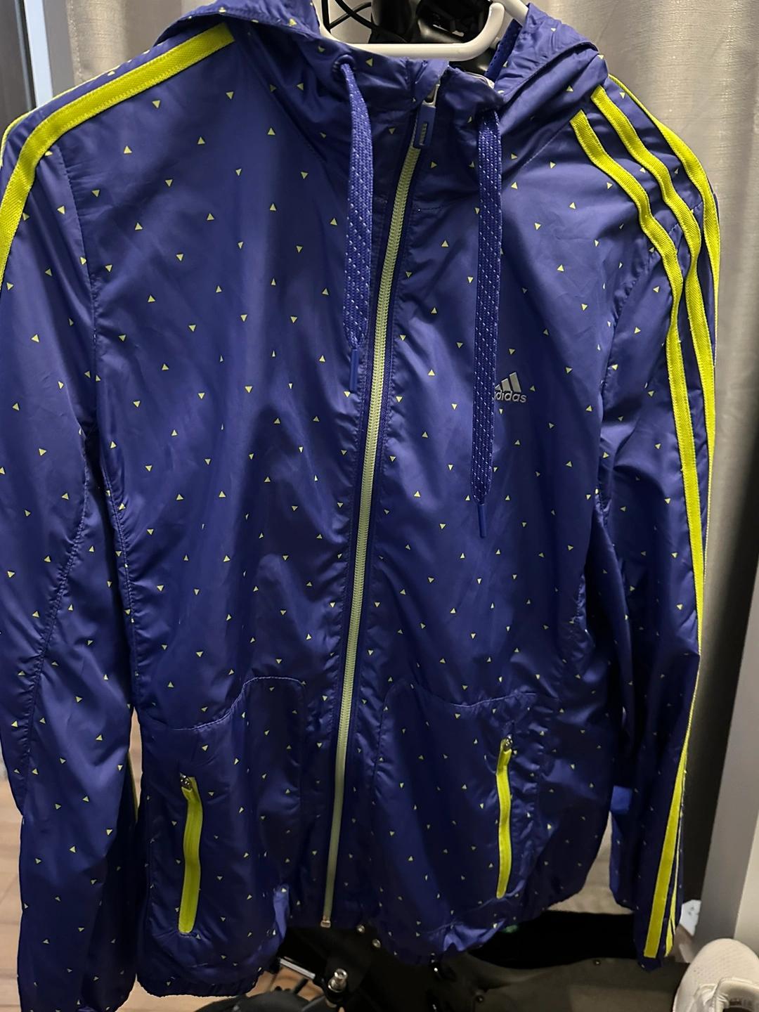 123BRAND NEW! Purple and yellow patterned jacket with a hood and zip closure. Features three yellow stripes on the sleeves and two zippered pockets.