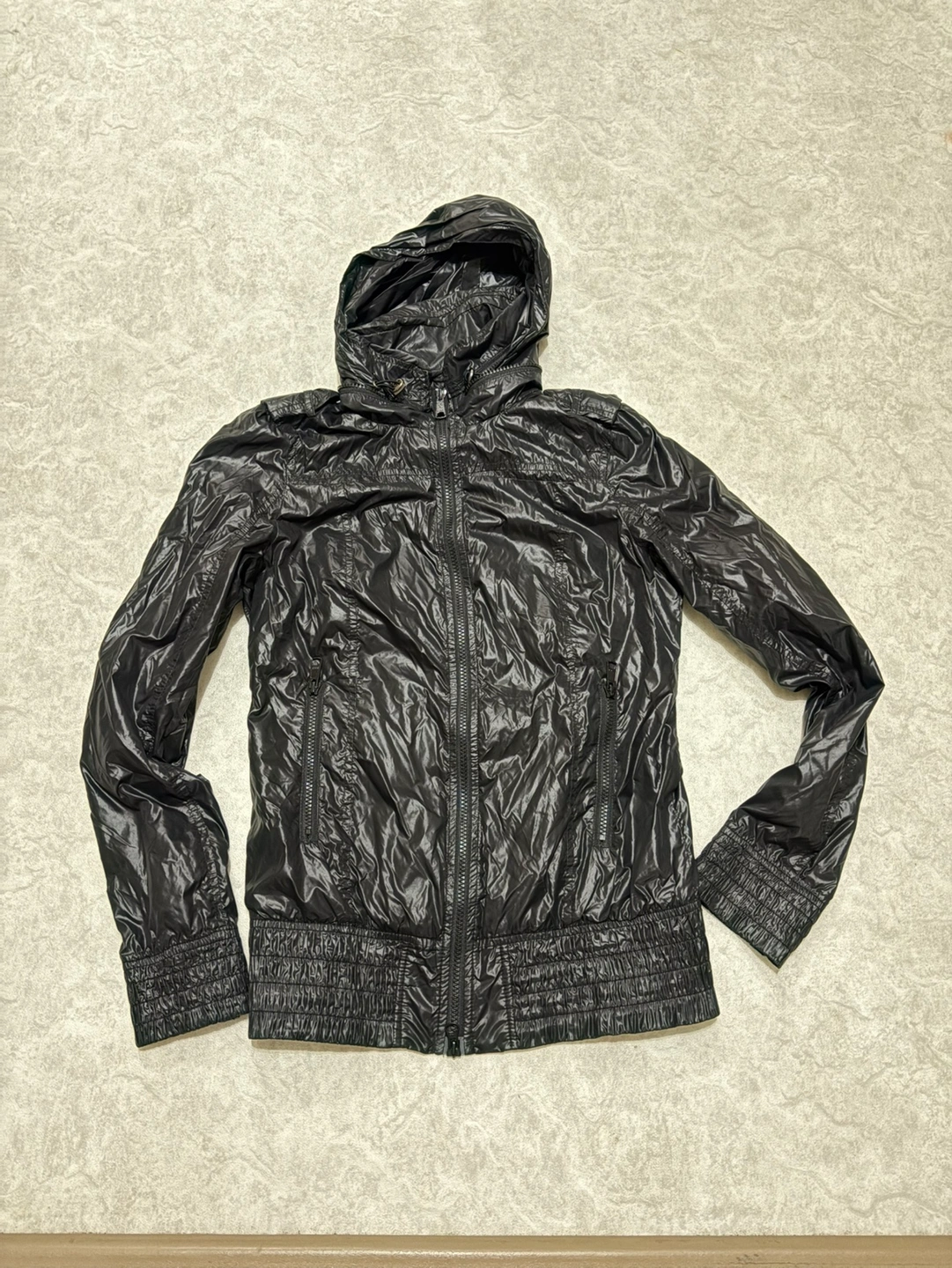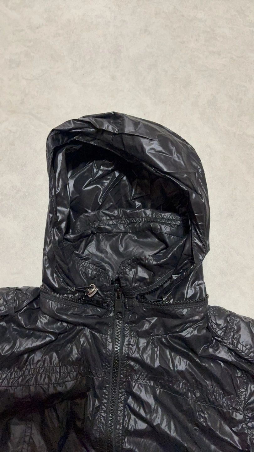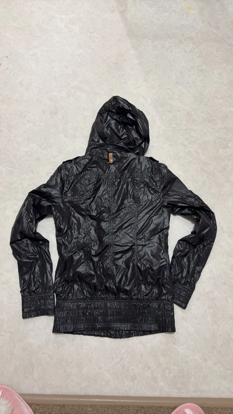Black hooded jacket with a zipper closure. It has two pockets on the front. The jacket has an elastic waistband and a leather tag with the brand logo. The hood can be hidden. It is made of a shiny, nylon fabric.