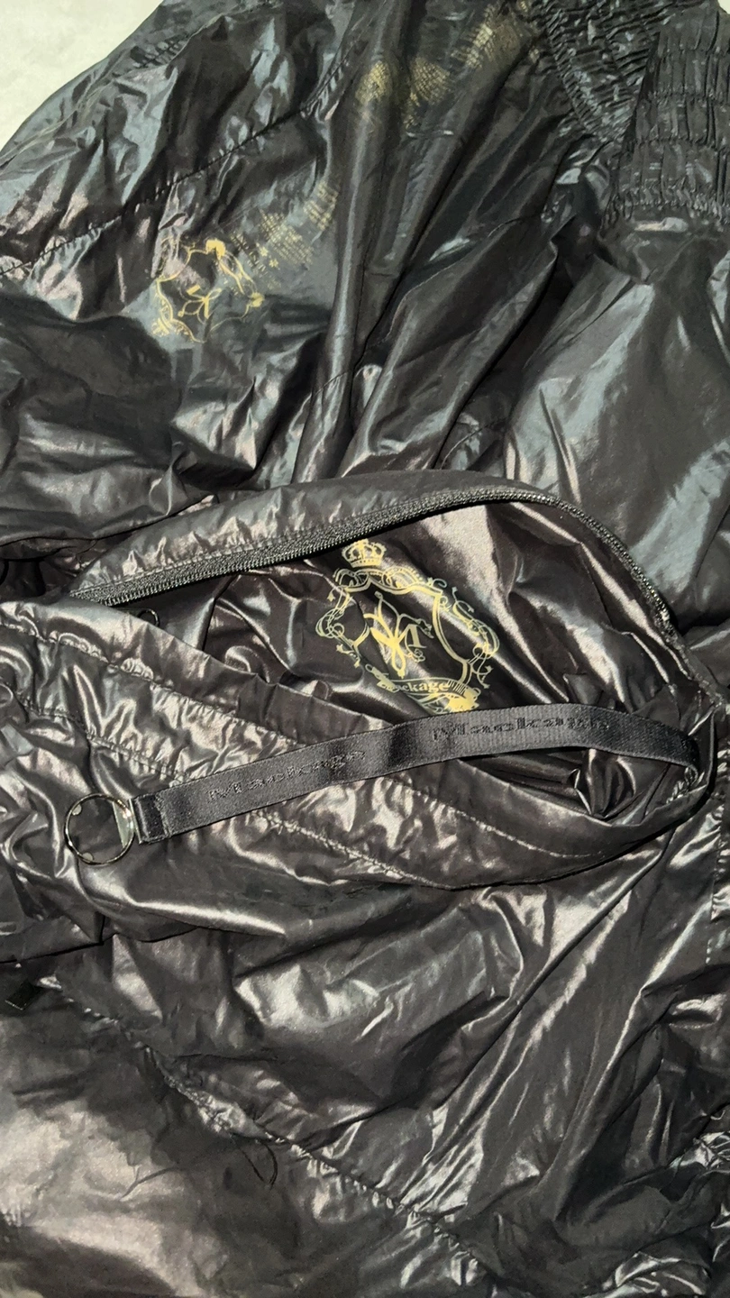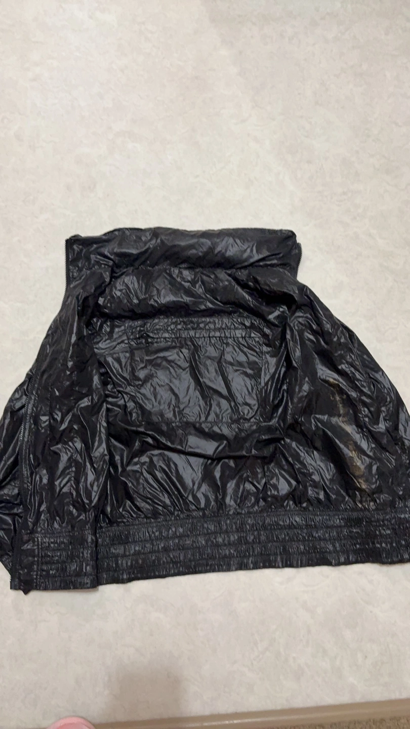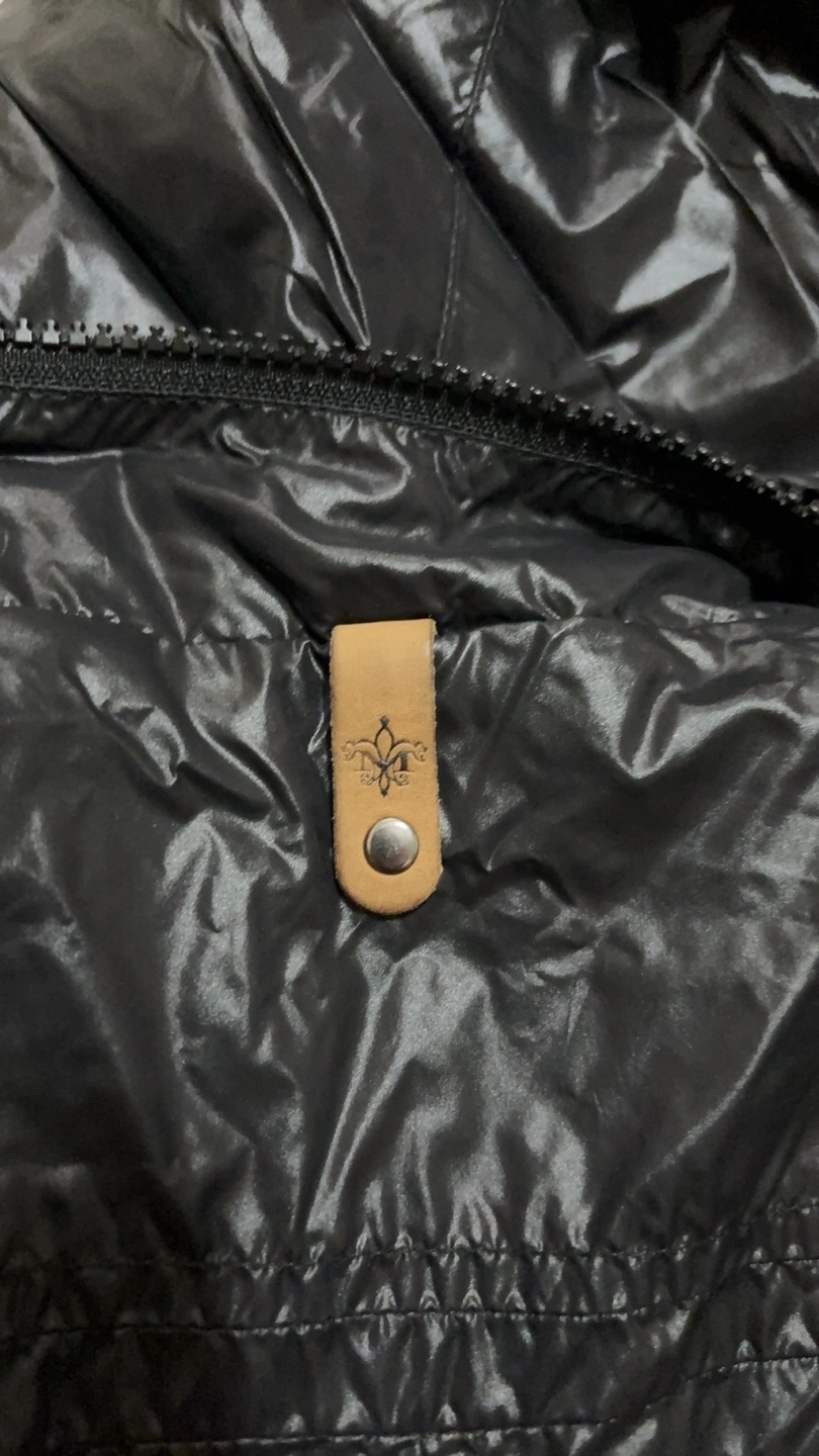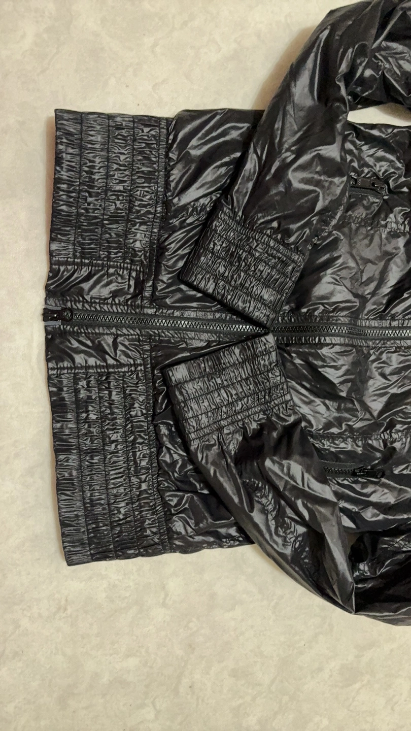 Black hooded jacket with a zipper closure. It has two pockets on the front. The jacket has an elastic waistband and a leather tag with the brand logo. The hood can be hidden. It is made of a shiny, nylon fabric.