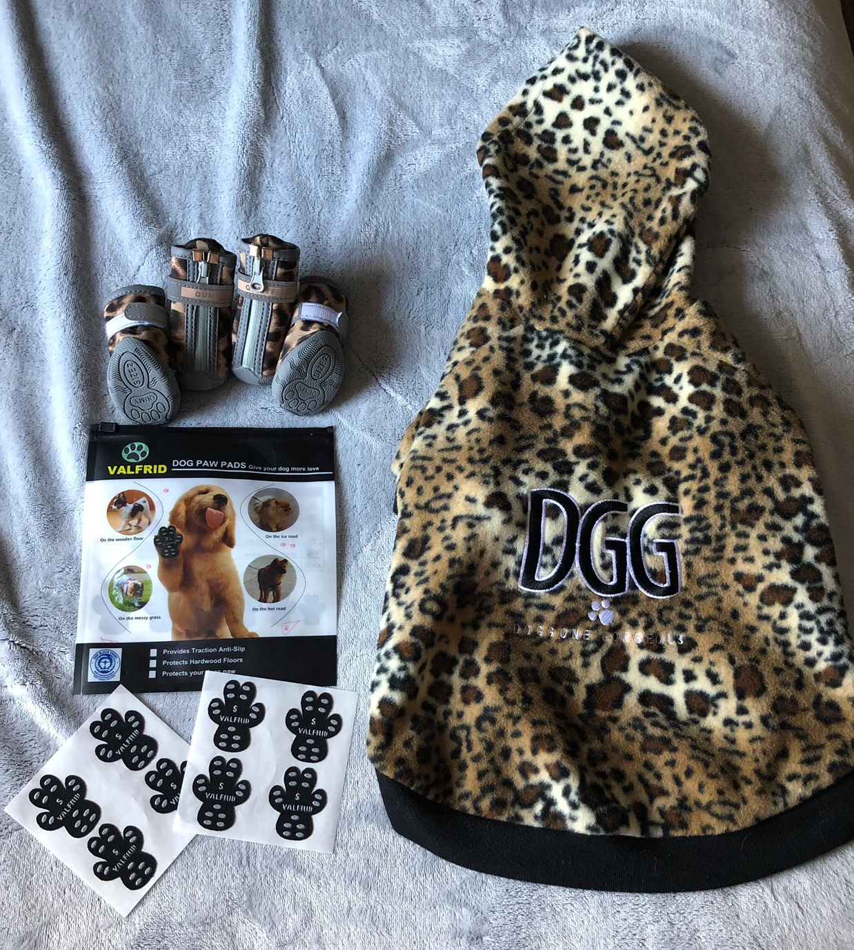 Dog hoodie and shoes in a leopard print. Hoodie is size medium. Shoes are size 2 and have a reflective strip and anti-slip rubber soles. Set also includes 8 paw pads. Perfect for a small breed dog around 10-12 pounds. Everything brand new:) never got used.