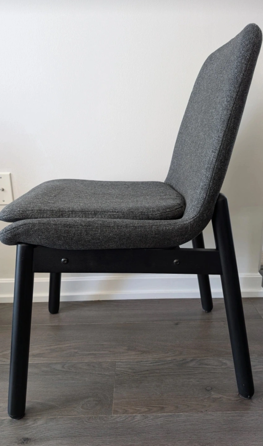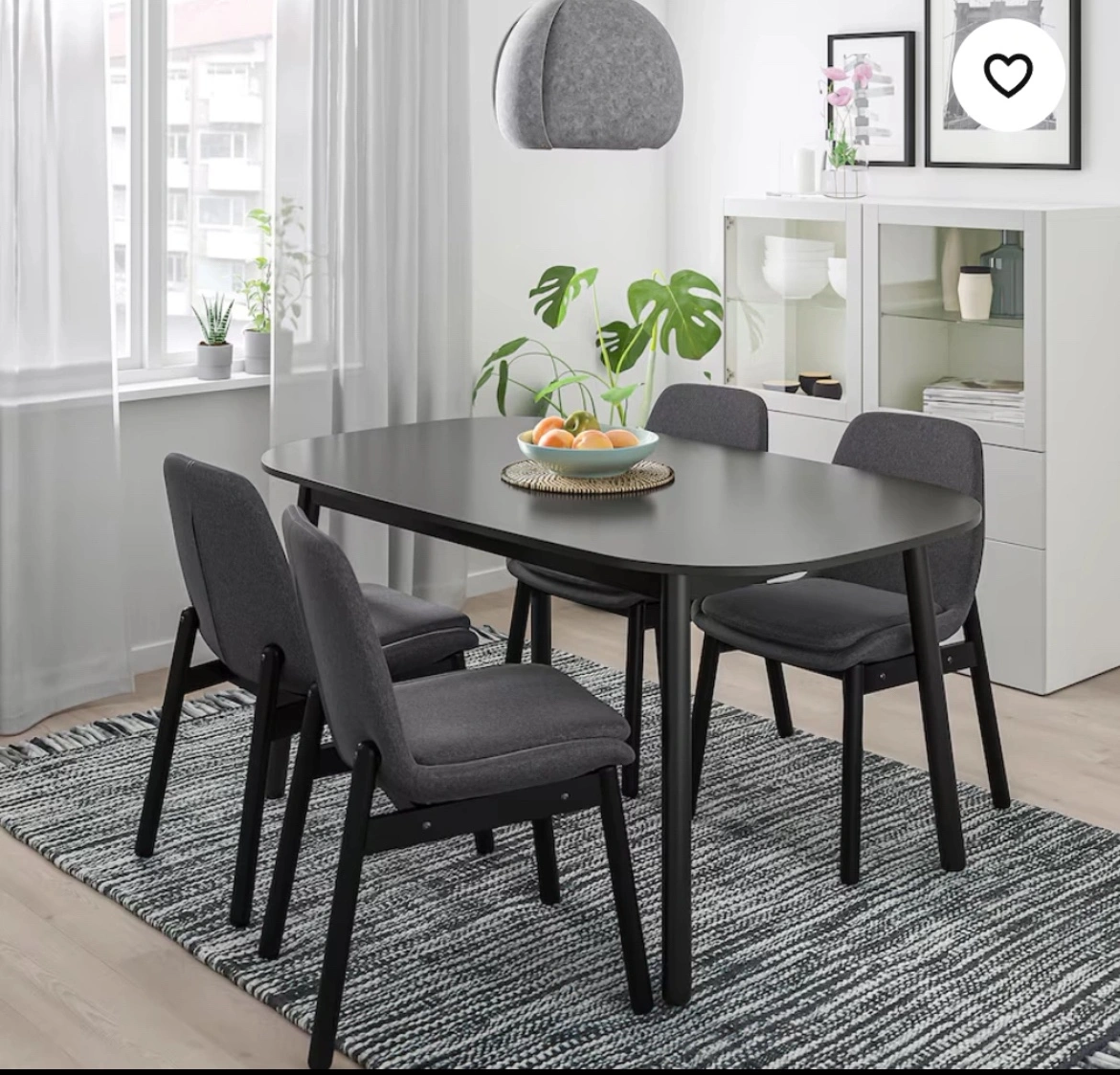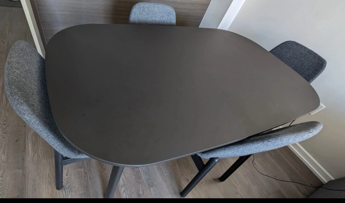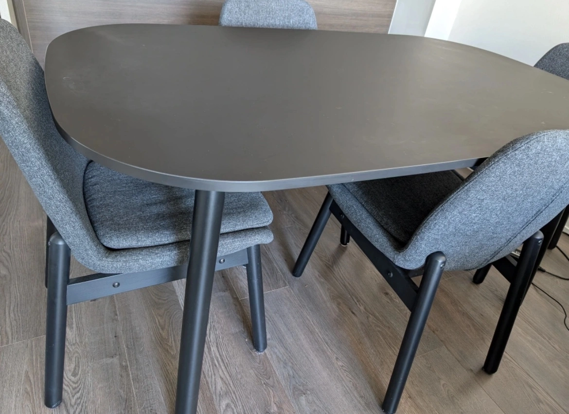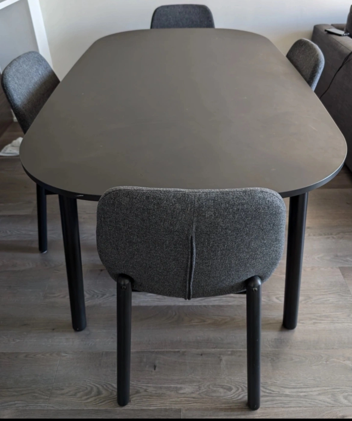 781Black table ($300) with four grey chairs ($50 each). The table is oval-shaped. The chairs have a rounded back with a thick grey fabric seat. The table and chairs are in amazing condition with some minor wear and tear. The table legs and chair legs are black. Table originally $699 Asking $300 https://www.ikea.com/us/en/p/vedbo-dining-table-black-40403146/ Chairs originally $240/each Asking $50 each https://www.ikea.com/ca/en/p/vedbo-chair-black-gunnared-dark-gray-40417983/