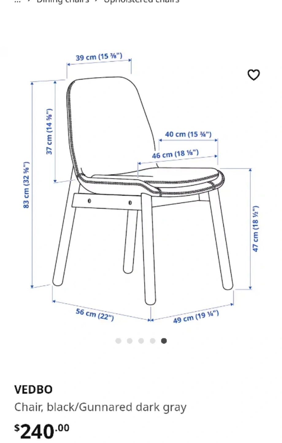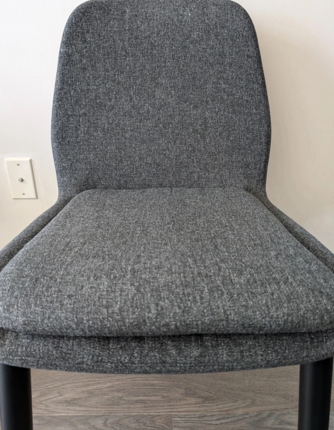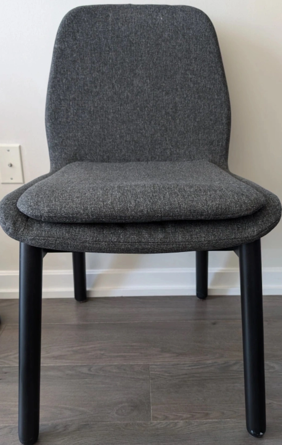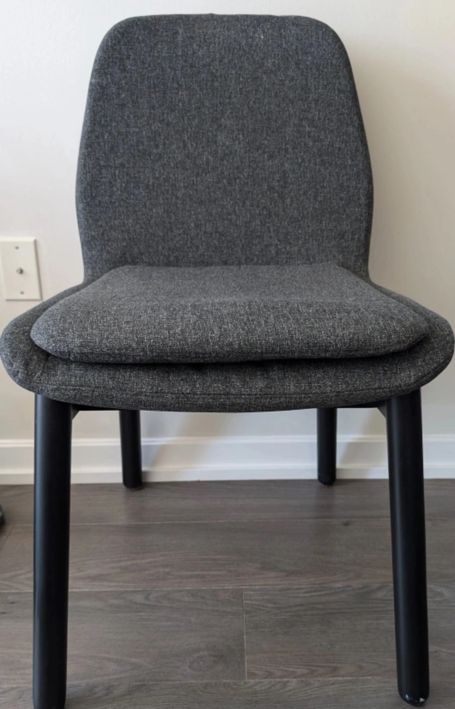 781Black table ($300) with four grey chairs ($50 each). The table is oval-shaped. The chairs have a rounded back with a thick grey fabric seat. The table and chairs are in amazing condition with some minor wear and tear. The table legs and chair legs are black. Table originally $699 Asking $300 https://www.ikea.com/us/en/p/vedbo-dining-table-black-40403146/ Chairs originally $240/each Asking $50 each https://www.ikea.com/ca/en/p/vedbo-chair-black-gunnared-dark-gray-40417983/