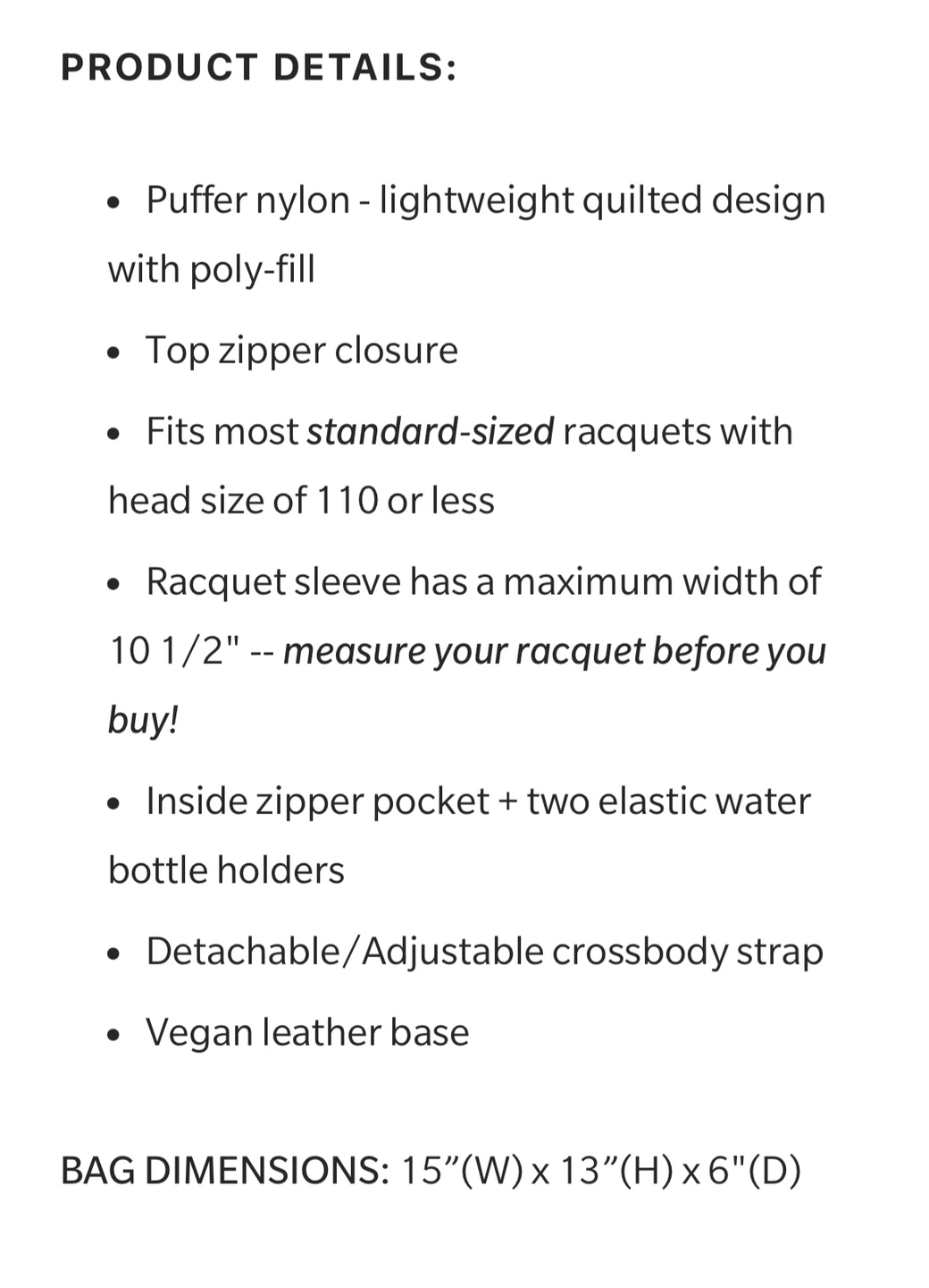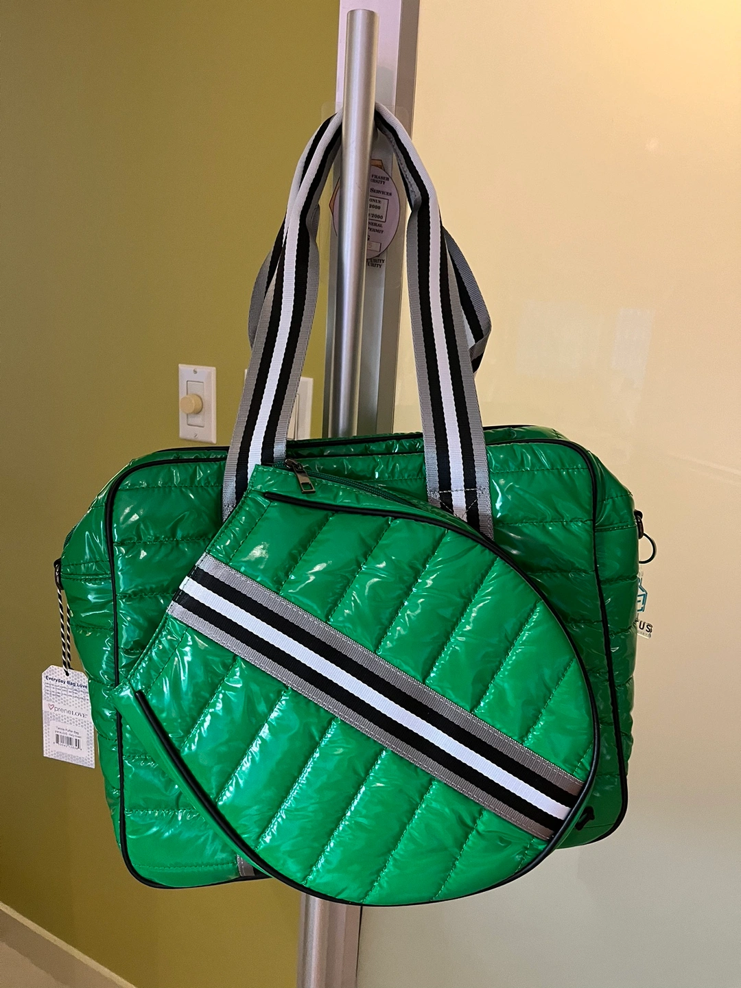 Designer tennis puffer bag by Prenelove. Brand new with tags . It is high quality and very well constructed. Inside compartment is quite large. Holds one racket in the side pocket.