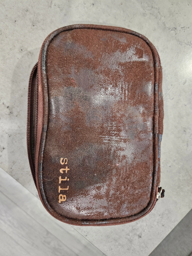 36Brown suede makeup bag with zipper closure.