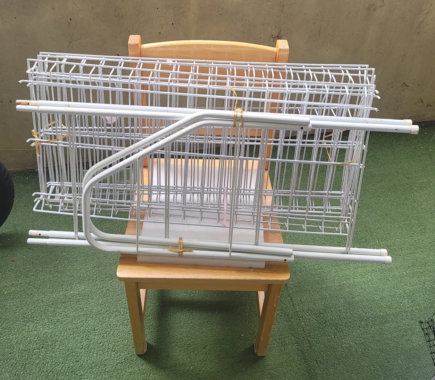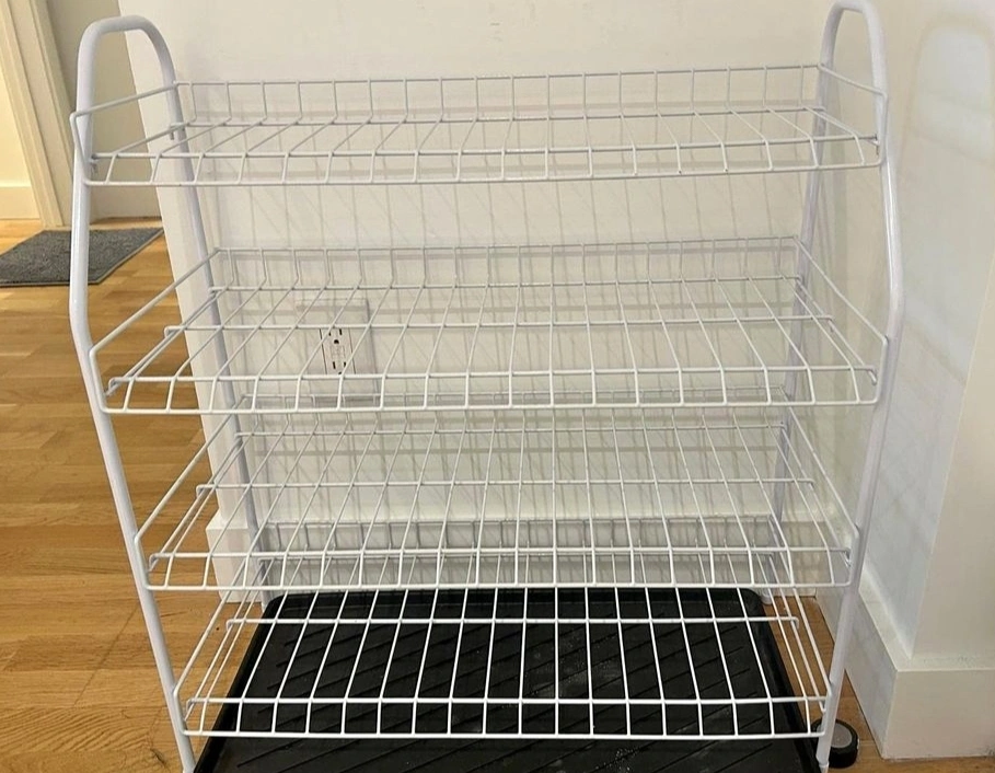 44A white metal four-tier shoe rack with a mat on the bottom. It is approximately 30 inches tall, 16 inches wide, and 10 inches deep. The shelves are approximately 5 inches high. The rack is made of sturdy wire and is perfect for storing shoes. It is easy to assemble and disassemble.