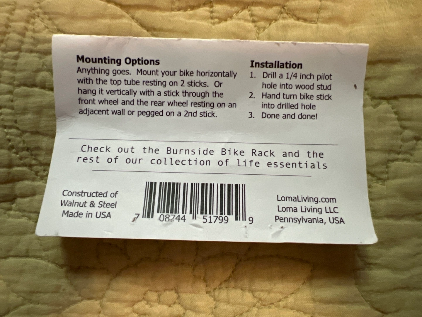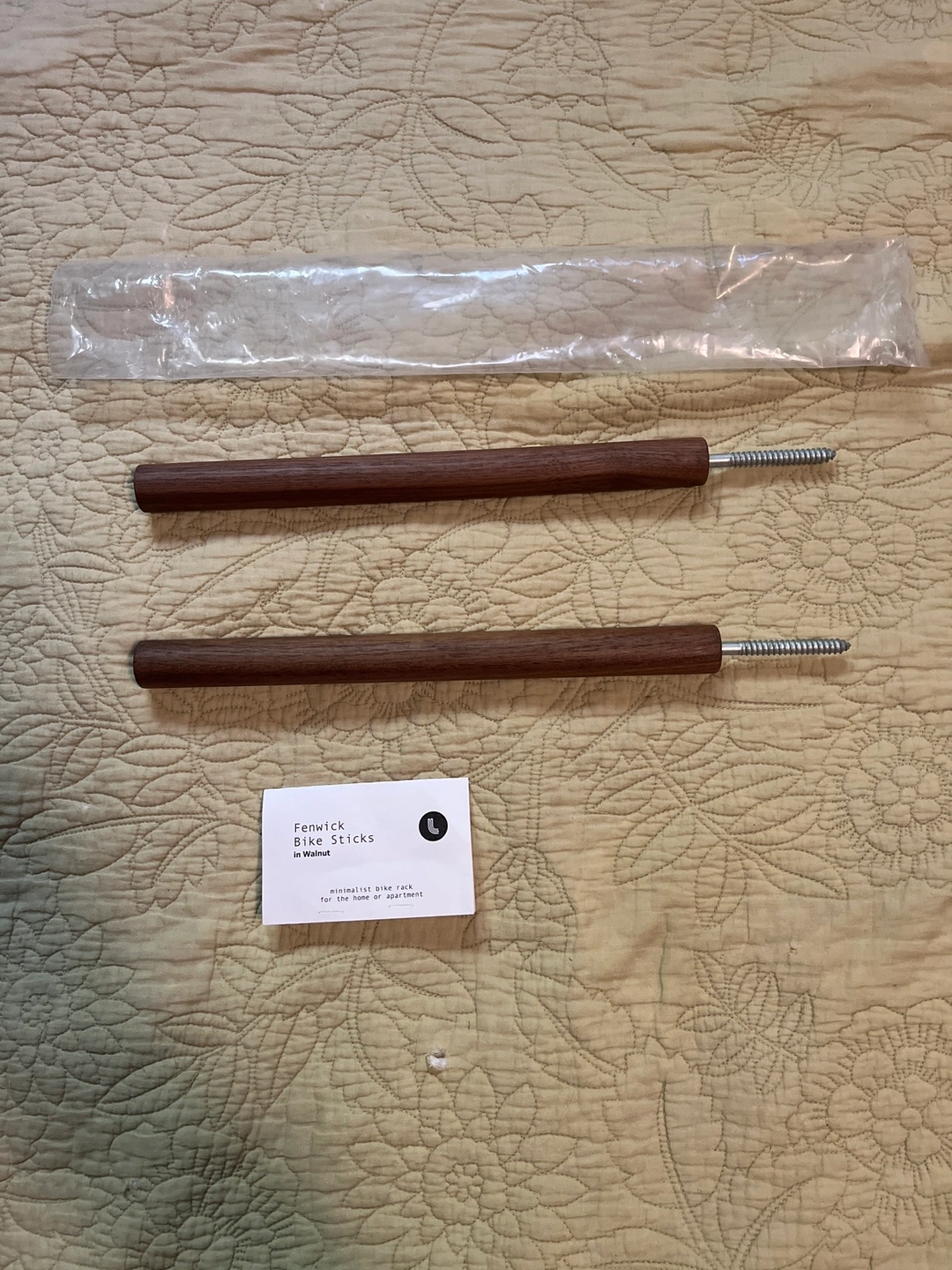 Two walnut wood bike rack sticks for mounting a bike horizontally. Made in USA. 12inches long with 2.75 inches screw New never used. I didn’t have wood studs