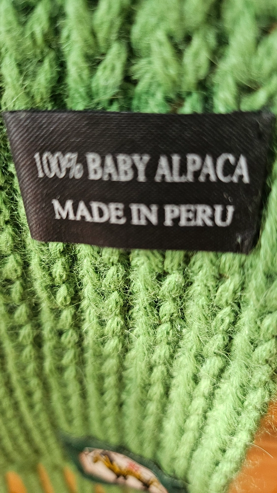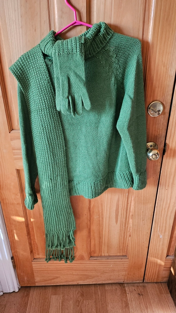 MAKE OFFER!!!!! Bright green alpaca wool sweater with matching gloves and fully detachable scarf. So soft!! Some pilling on front right side as shown, but otherwise in impeccable condition. So warm! 100% baby alpaca, made in Peru. A great find! Available for pick-up near Oakwood Village.