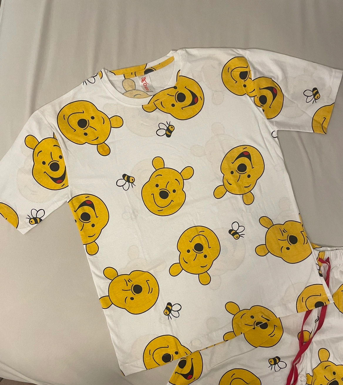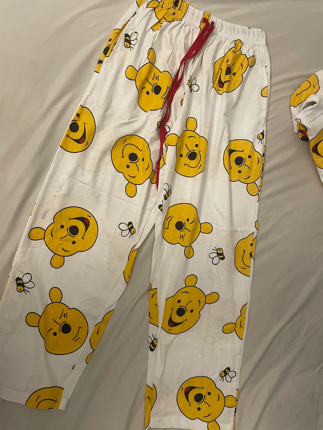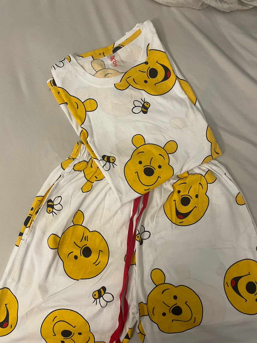 A fun and comfortable Winnie the Pooh pajama set, perfect for relaxing at home! The top and pants are both printed with Winnie the Pooh and bees. The pants have a drawstring waistband and a red drawstring. They also have pockets!
