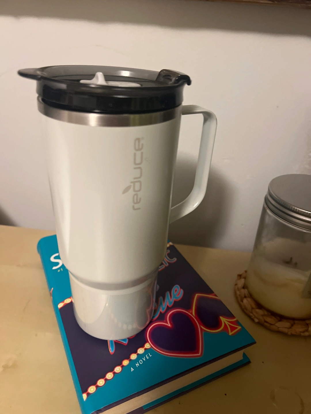White travel mug with a black lid and handle. It is double-walled and keeps beverages hot or cold for hours. It is dishwasher safe. It comes with a lid.