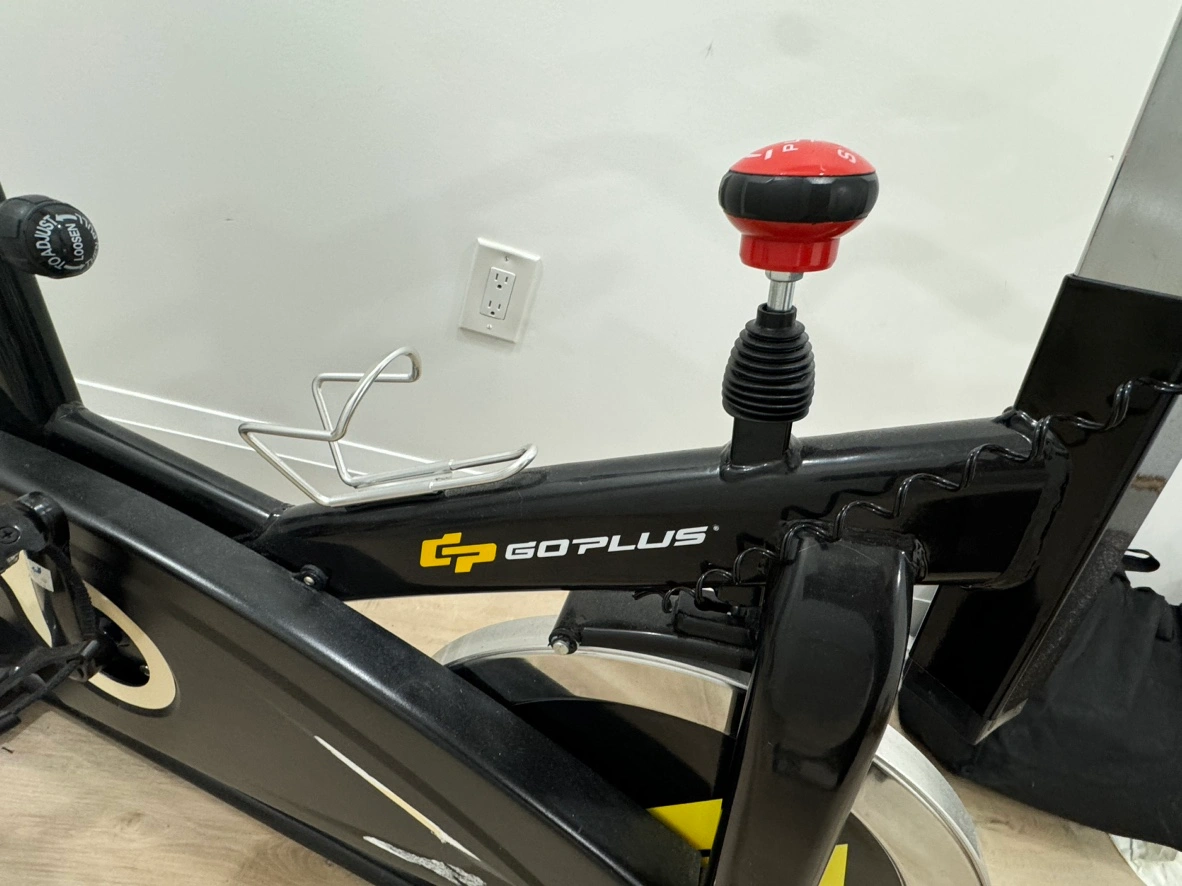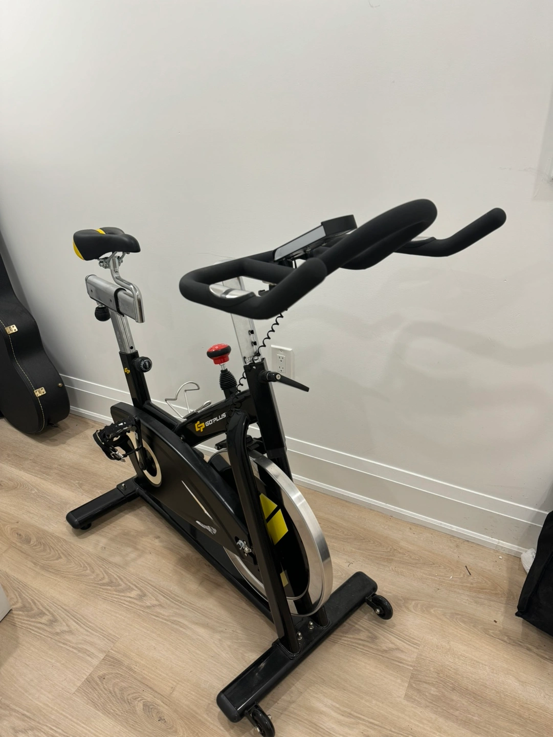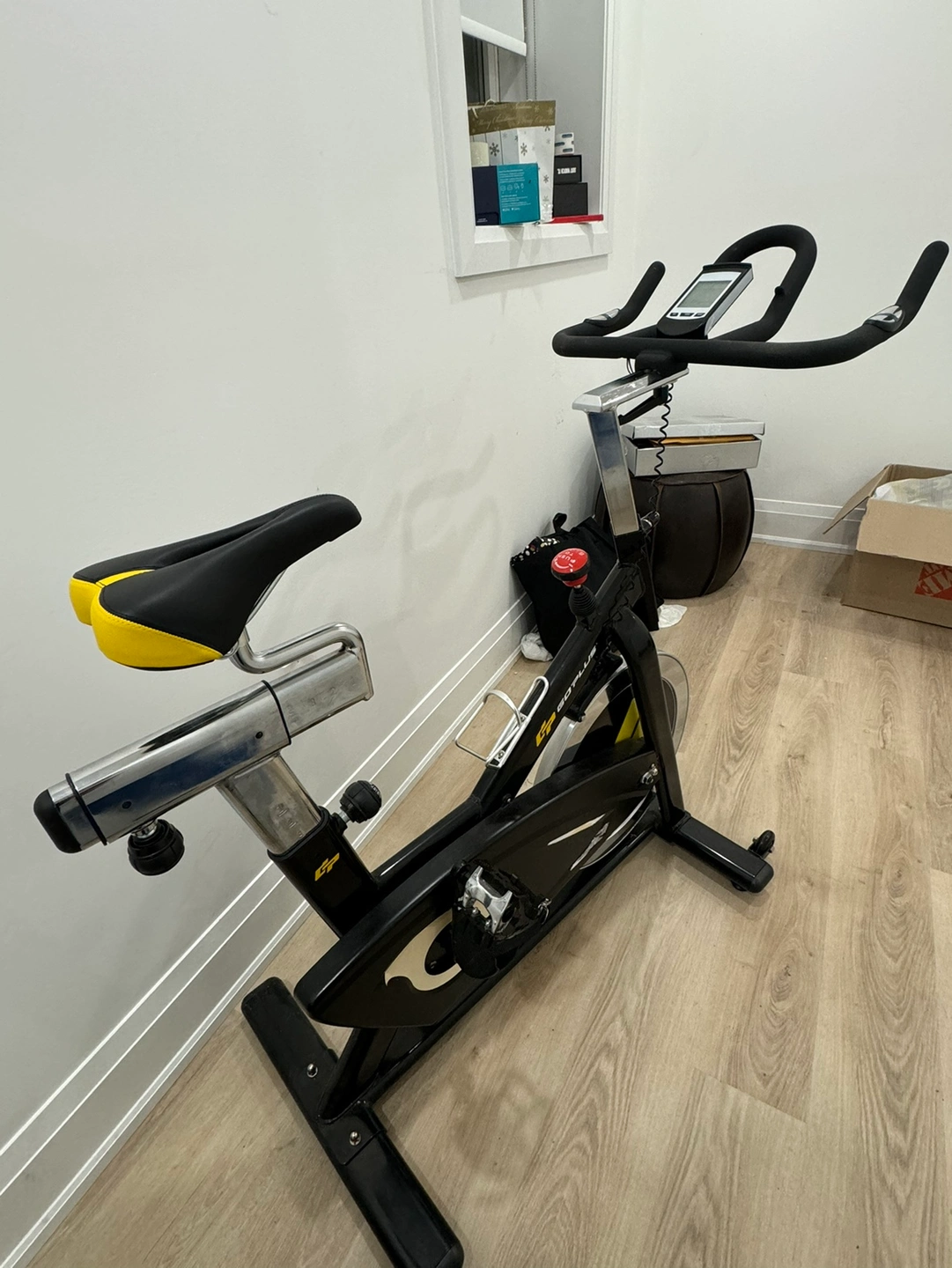 This is a black stationary exercise bike with a yellow trim. I bought the bike new in 2021. It has an adjustable seat, a monitor and handlebars. There’s also a water bottle holder on the bike. The bike is in good condition.