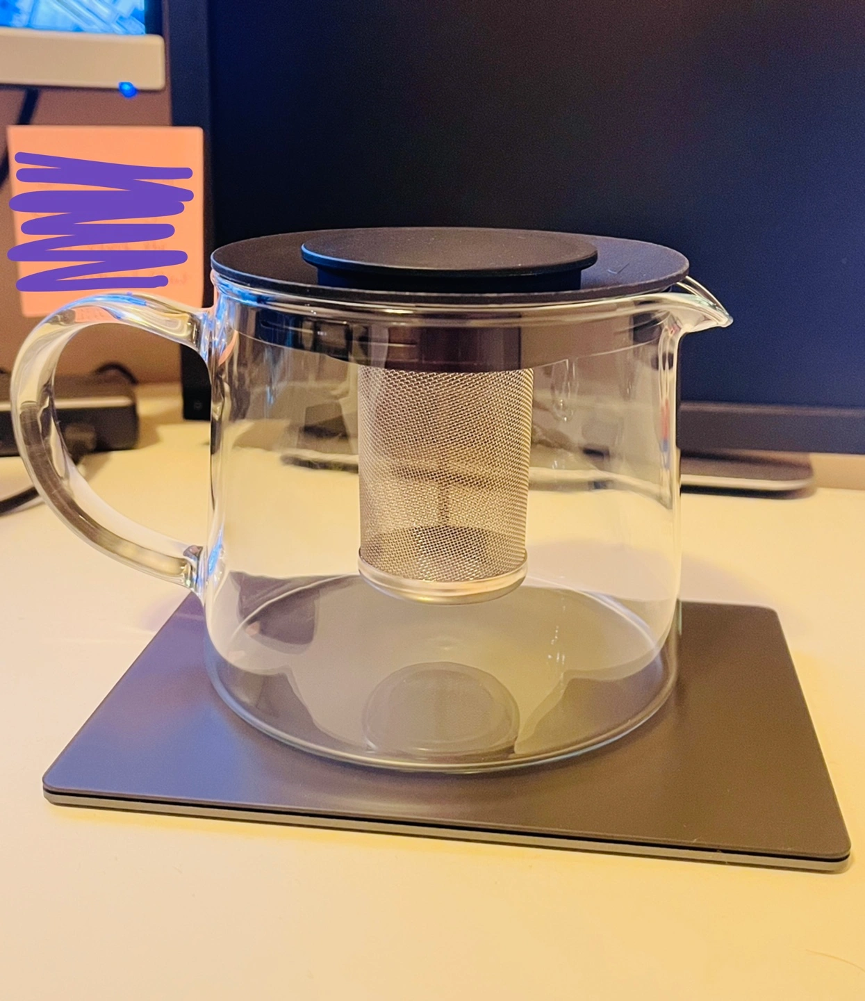 A glass teapot with a stainless steel infuser. The teapot has a black lid. The teapot holds approximately 800ml of liquid.