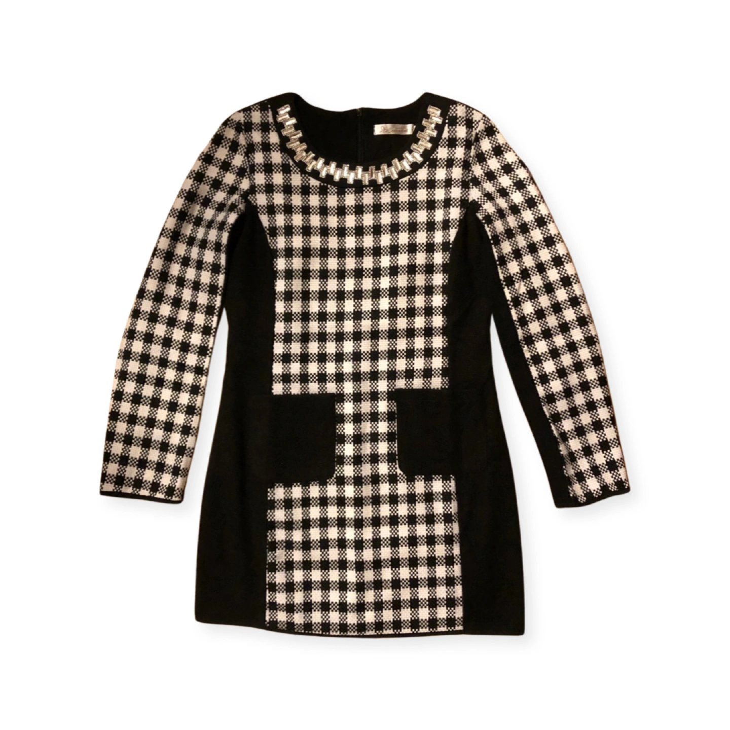 Checkered Pattern Dress with Jewel Neckline, Front Pockets