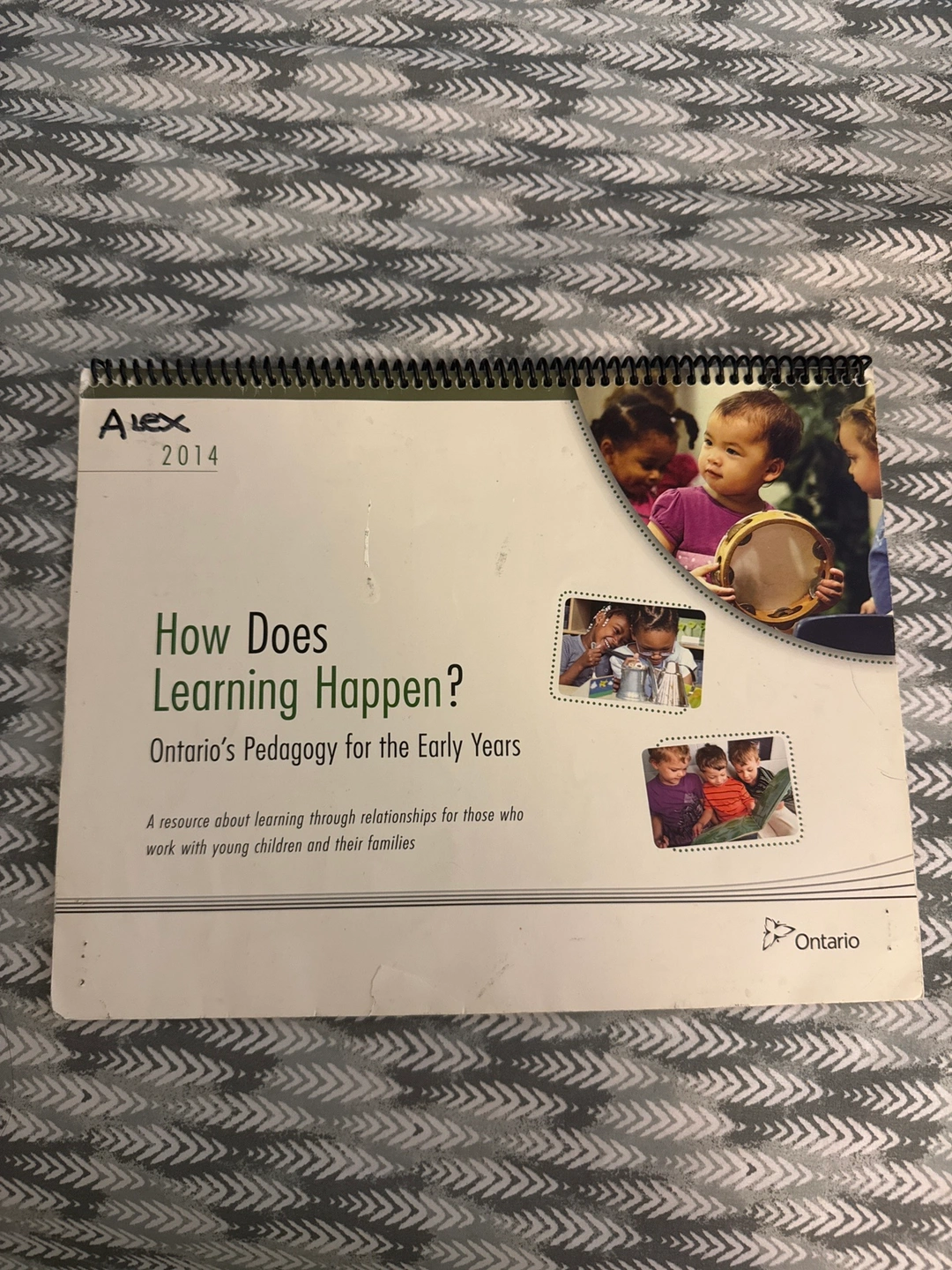 This is a bound volume textbook entitled "How Does Learning Happen? Ontario's Pedagogy for the Early Years". It is a resource about learning through relationships for those who work with young children and their families. #freecycle