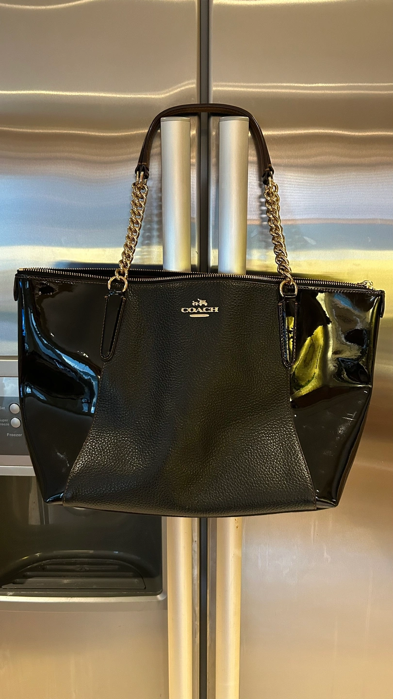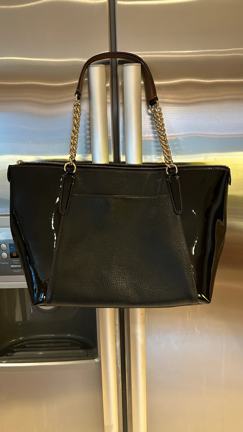 Large black leather tote bag with patent sides and gold embellishments.