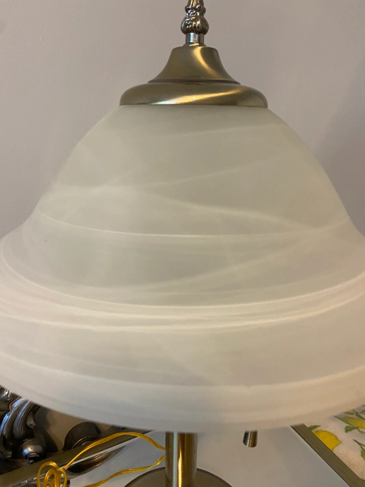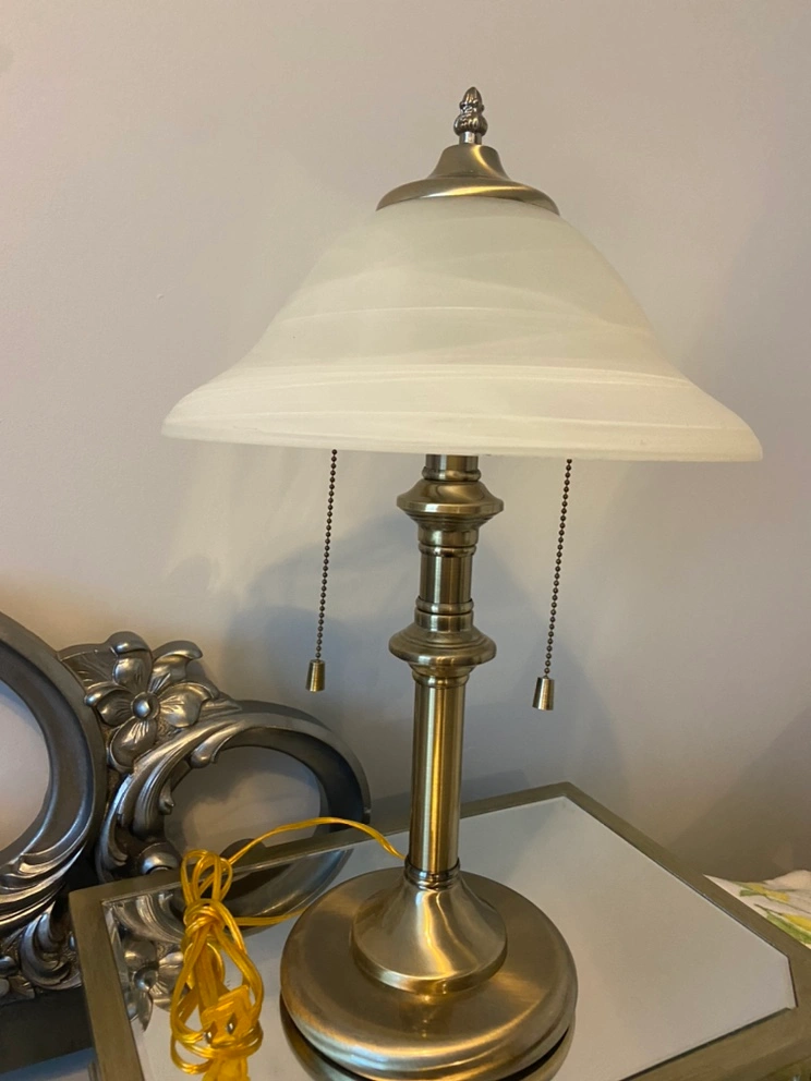 Brushed Nickel with gold undertones table/desk lamp with white alabaster shade. Features two light bulbs and pull chains to control. The lamp is in good condition….There are no chips or cracks in the shade.