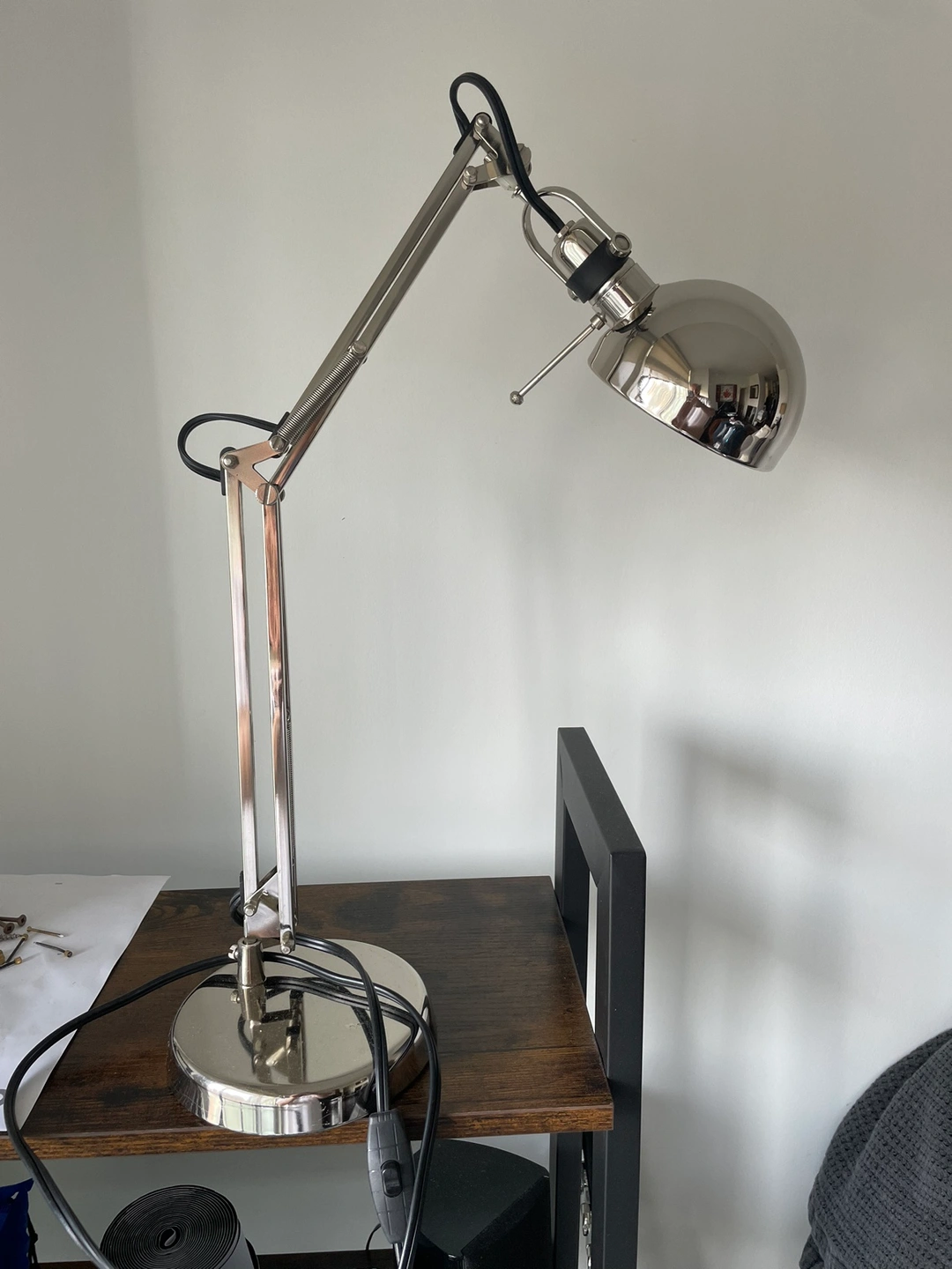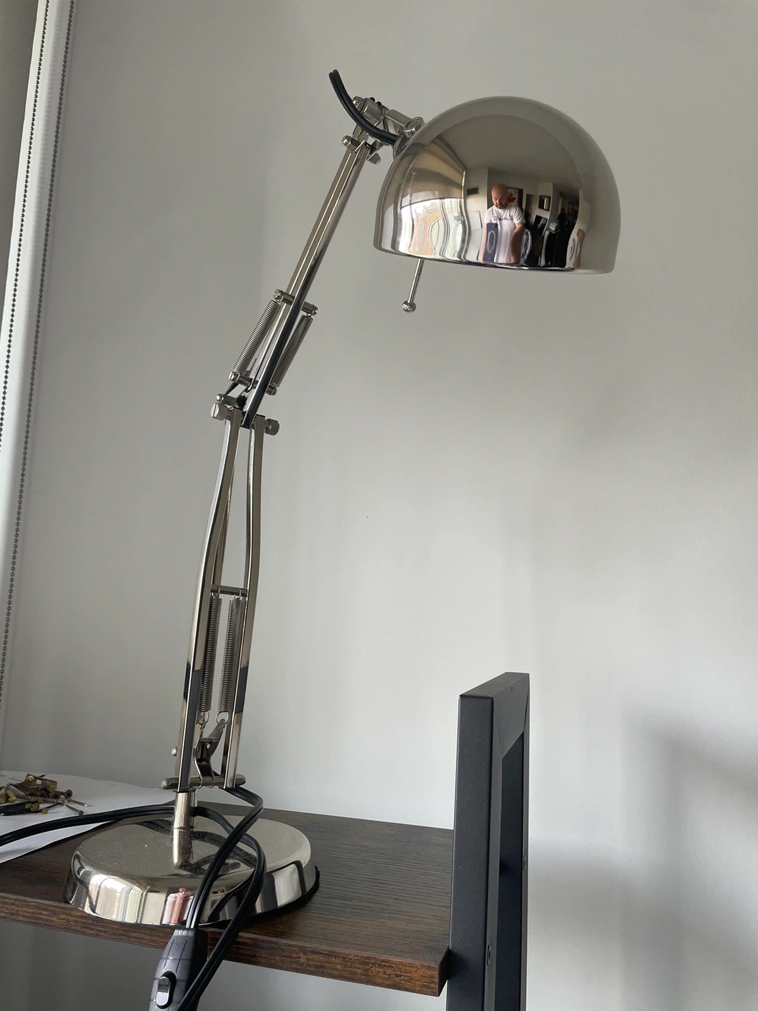 A stylish silver desk lamp with an adjustable arm. The lamp has a round base and a round shade. It is in good condition. Comes with two (2) lightbulbs