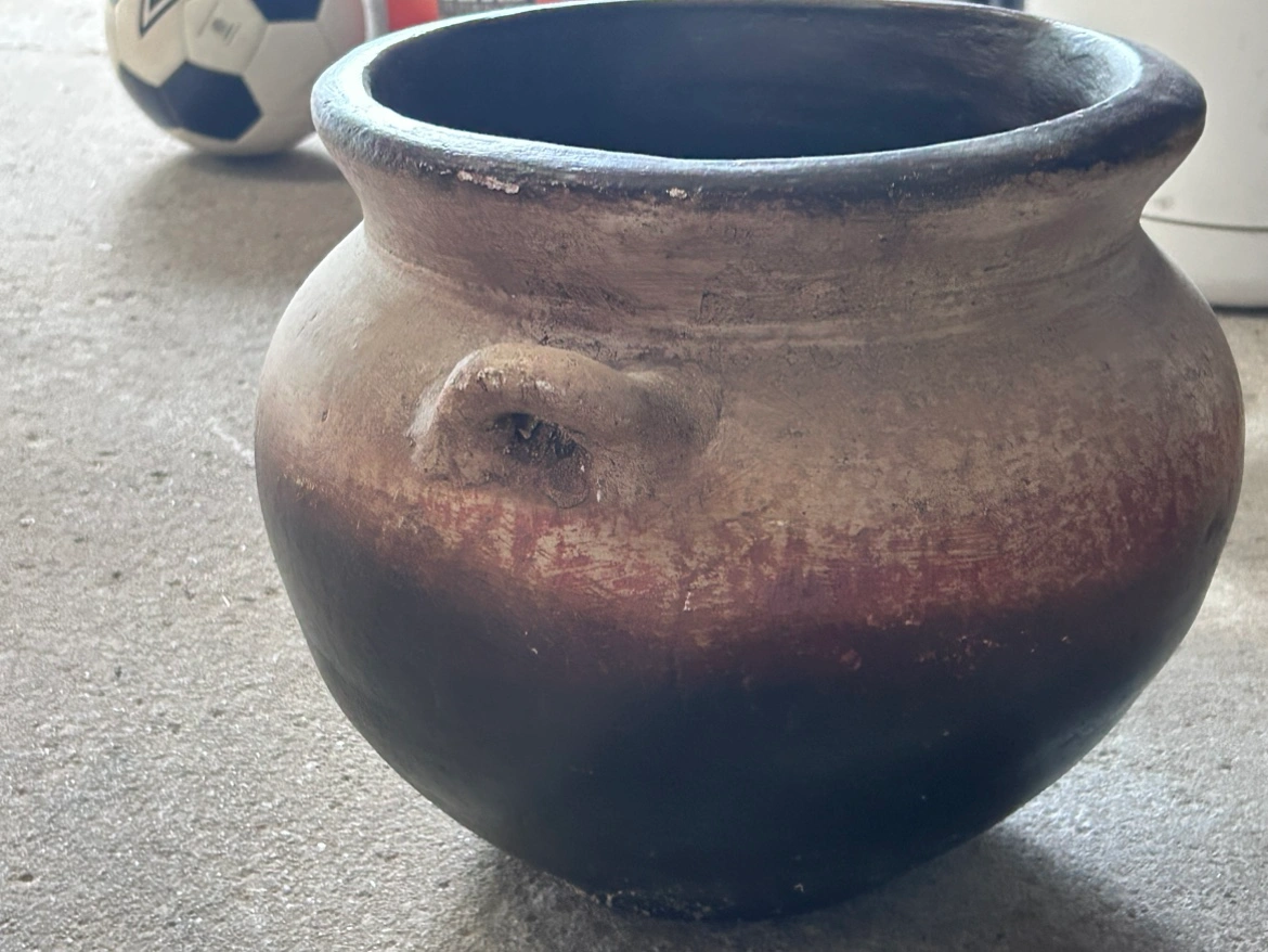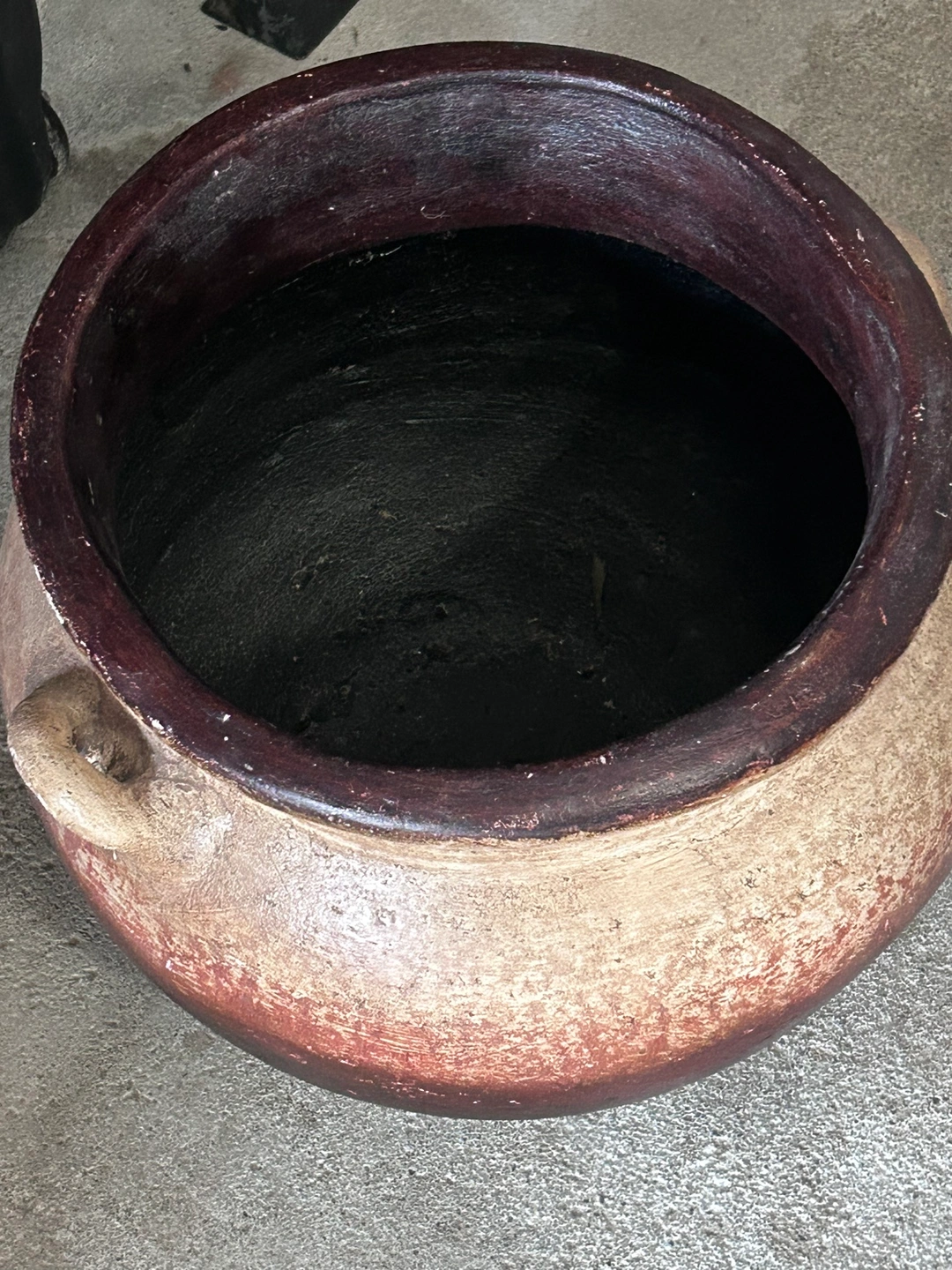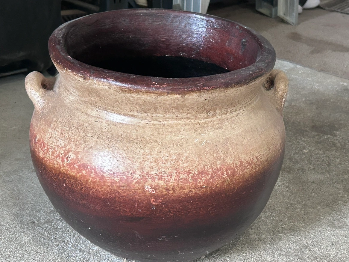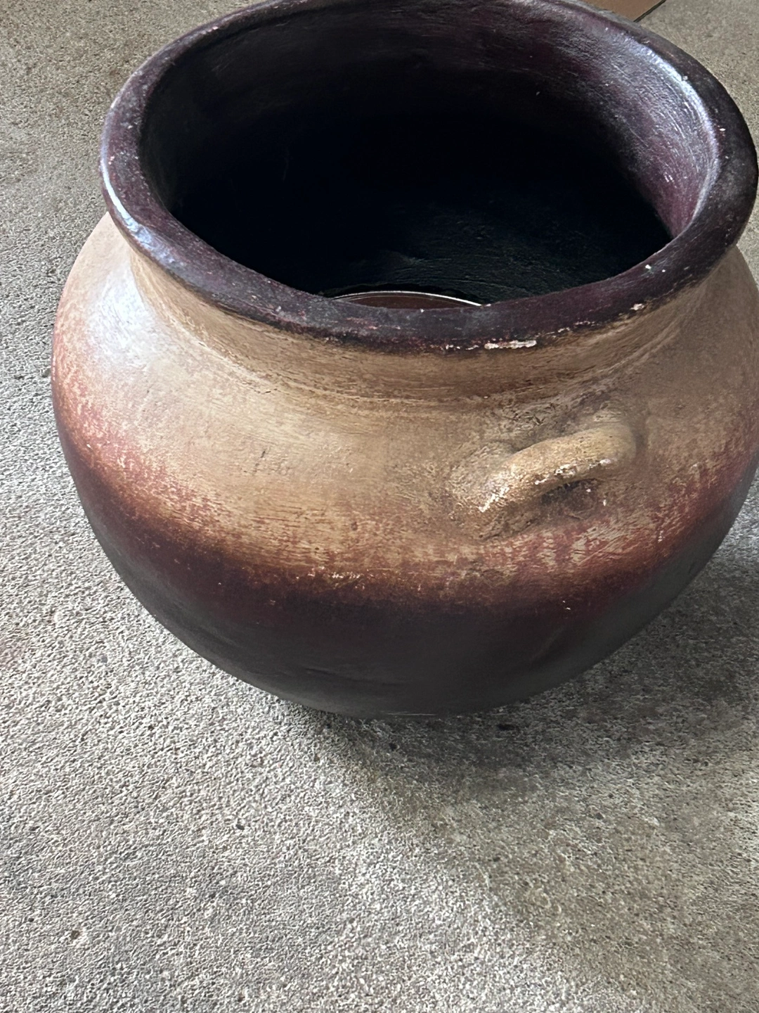 This pot is a great size for planting a large plant or for use as a decorative piece. It has two small handles. The pot has a brown and tan colour scheme.