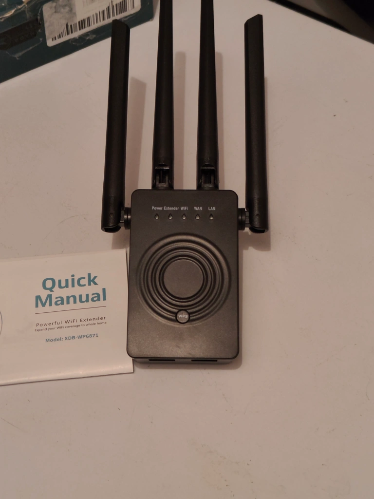 A wifi range extender with multiple antennas and push button setup. It works with any wifi router and has an ethernet port.