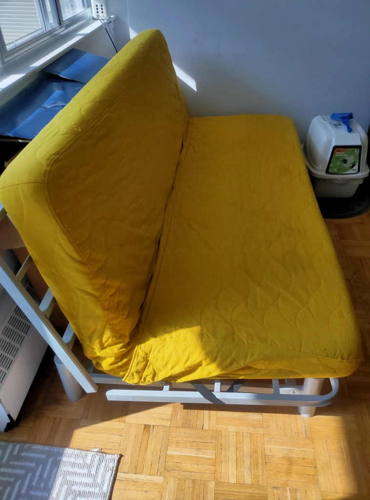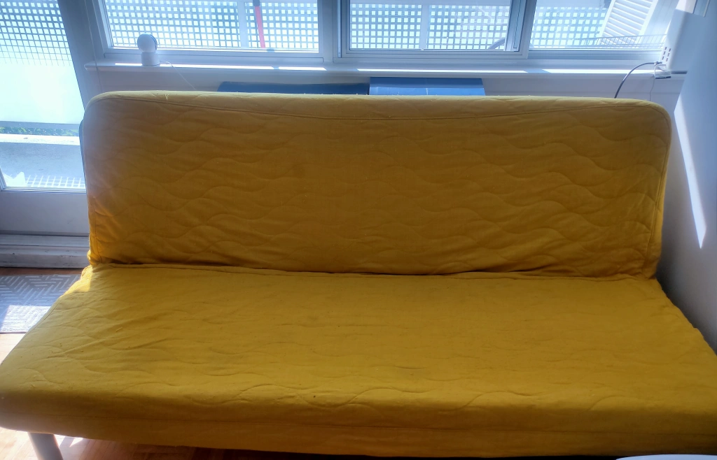 A yellow futon sofa bed with a metal frame and a quilted cover. It folds out into a bed. Almost become into a queen size bed when open. Only for pickup.