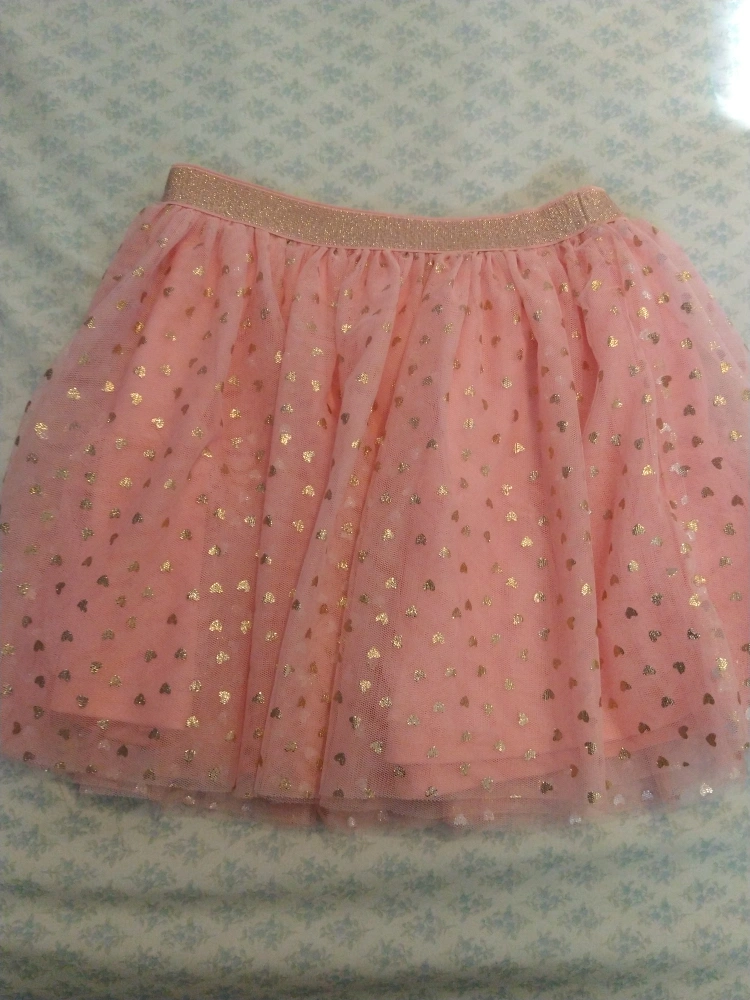 Pink tulle skirt with gold heart pattern and gold elastic waistband. Worn once. Size 8.