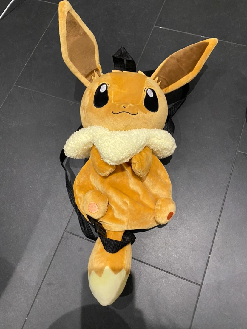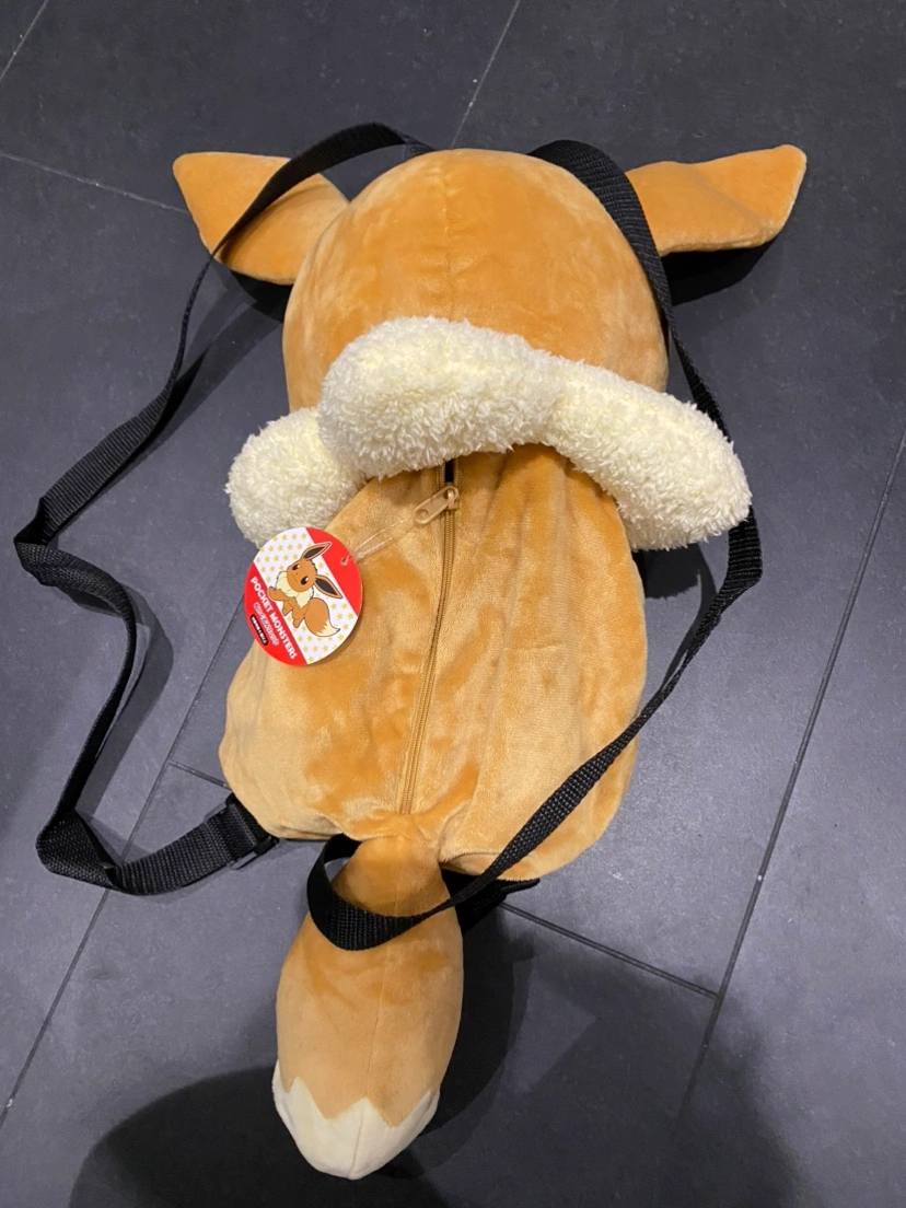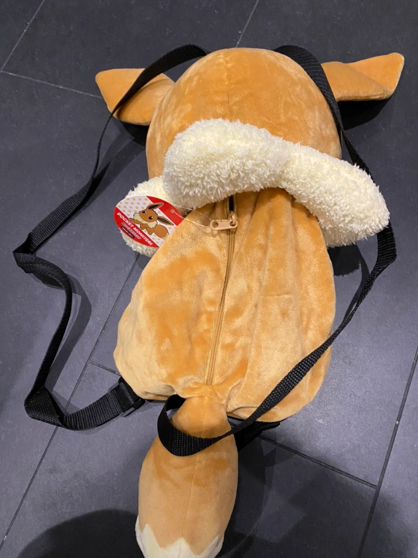 A plush backpack shaped like Eevee. It features a zippered pocket on the back and adjustable straps fits an adult and a child.