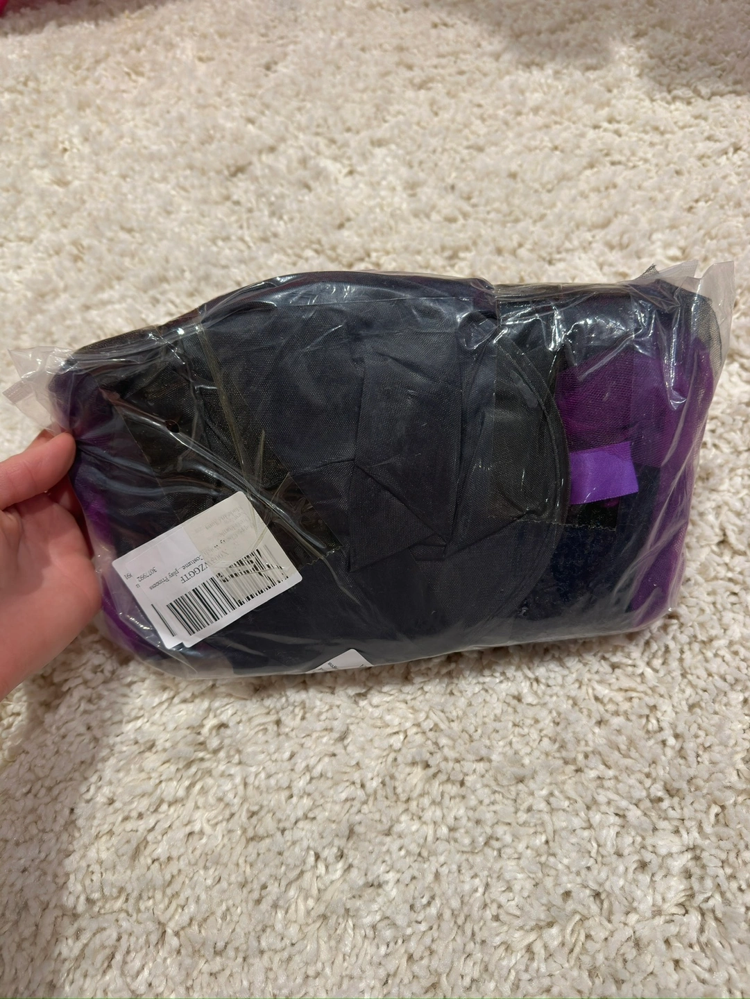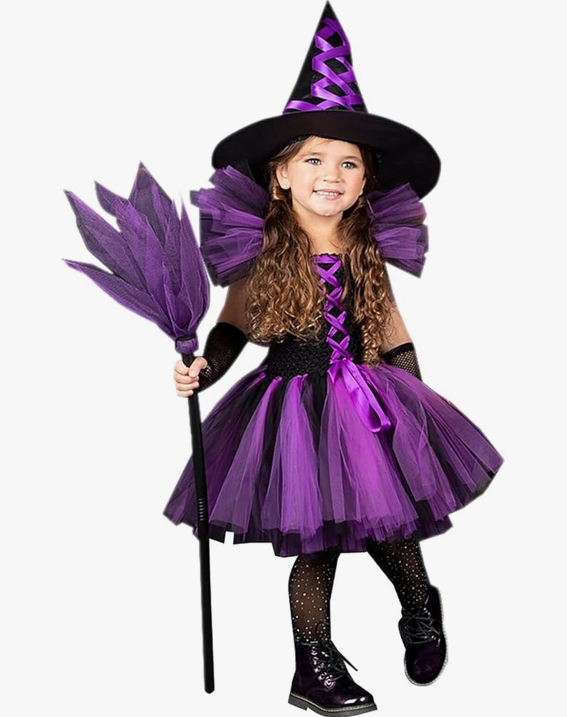 This is a cute Halloween costume for little witches. It includes a purple and black tutu dress & a black witch hat with purple ribbons.