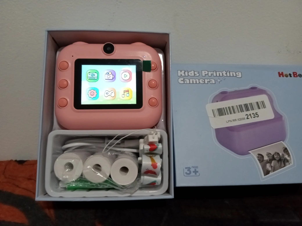 A pink kids' instant camera that takes photos and prints them. Includes a USB charging cable and a roll of photo paper.