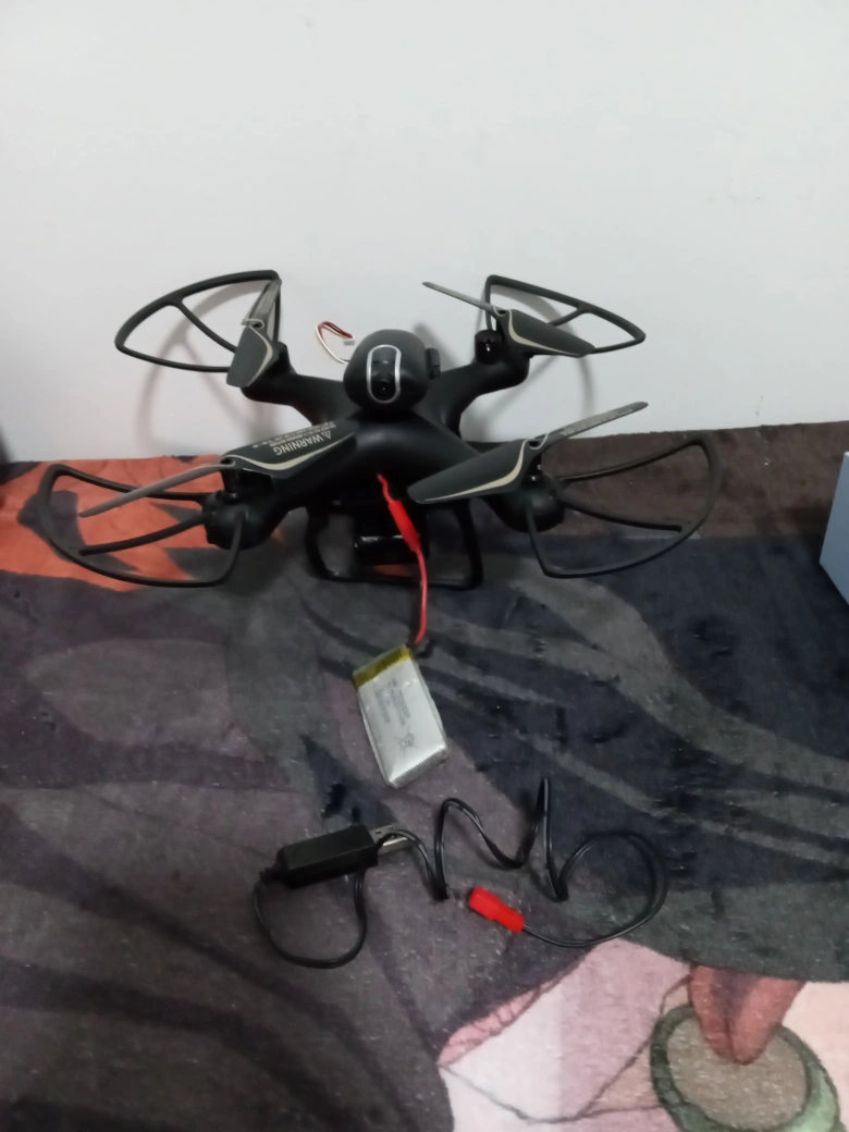Comes with a battery, charger, and remote. The drone features a camera, a 3D flip function, speed control, and more. The drone is in good condition. The drone is black in colour. The battery is in good condition. The charger is in good condition. The remote is in good condition. {You just need a new drone stack in the third photo is the battery mark} [I only used it twice]