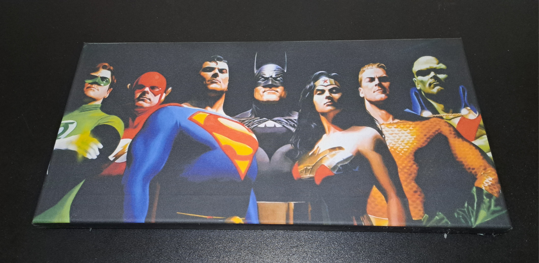 A fascimile canvas print of the Justice League by Alex Ross. This is not an original painting, nor an original print. I received it from a friend as a gift years ago, and it is a custom print on canvas that they had made. It measures 10"x20", and would look nice for any DC fan's collection.