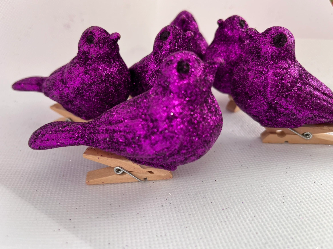 1000+Set of 5 purple glitter birds with wooden pegs. They are about 3 inches tall. They would look great on a Christmas tree or on a wreath. Asking 4$ for all 5